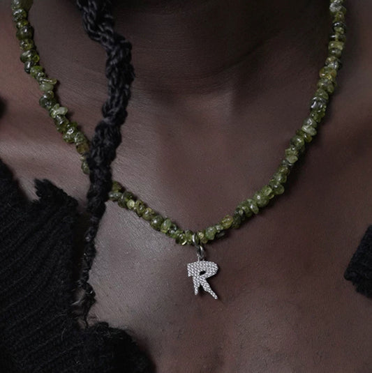 ALPHABET R NECKLACE IN SILVER WITH OLIVINE