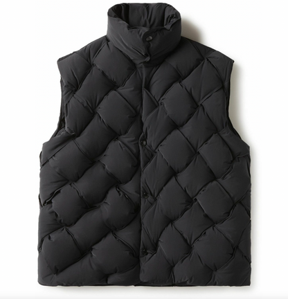 - Boxy fit, high neck, sleeveless, all-over interwoven pattern, lightly padded, slip pocket at interior