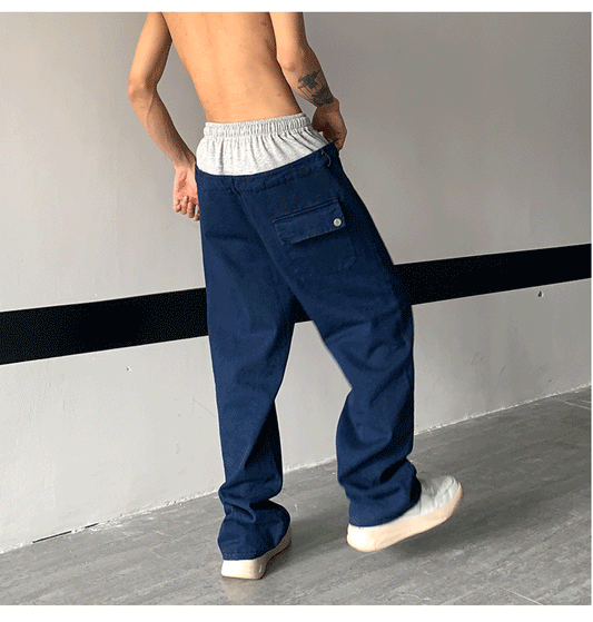 MULTI-LAYERED PANELS BAGGY DENIM JEANS - BLUE