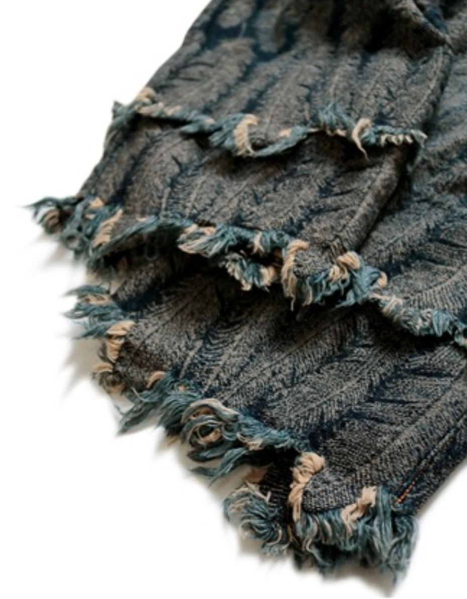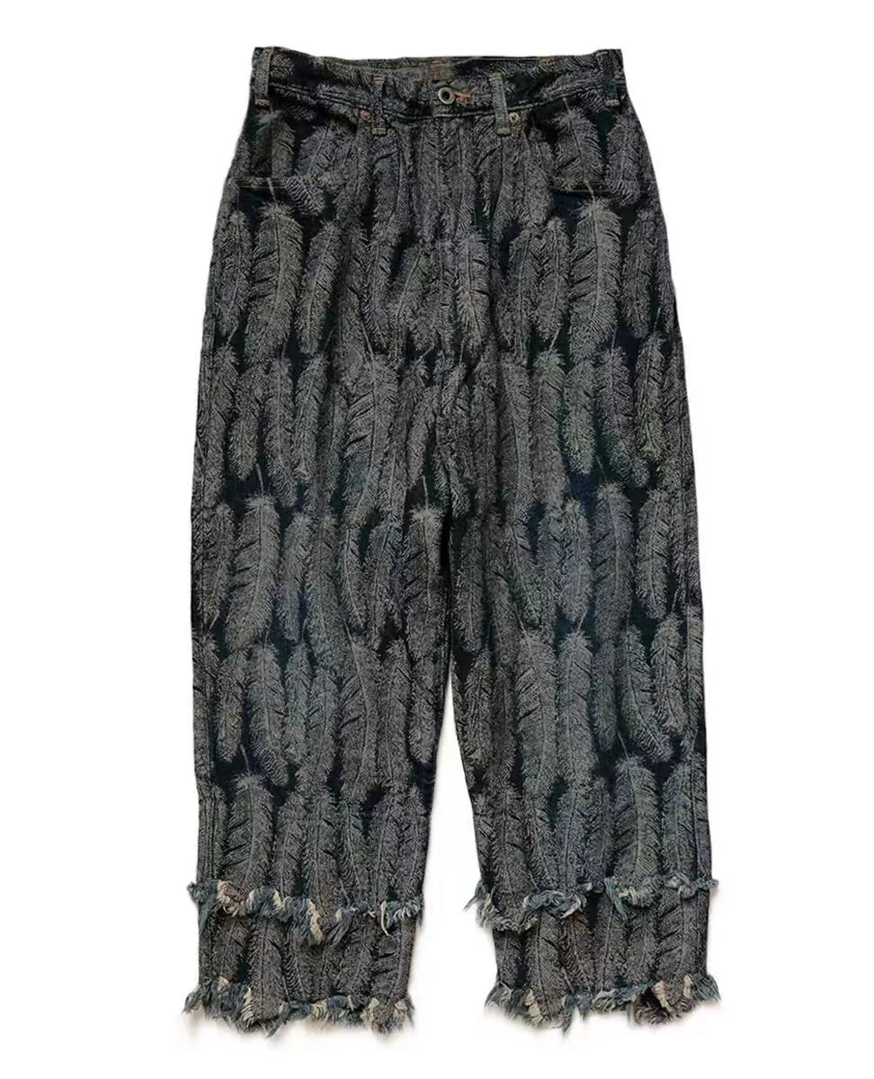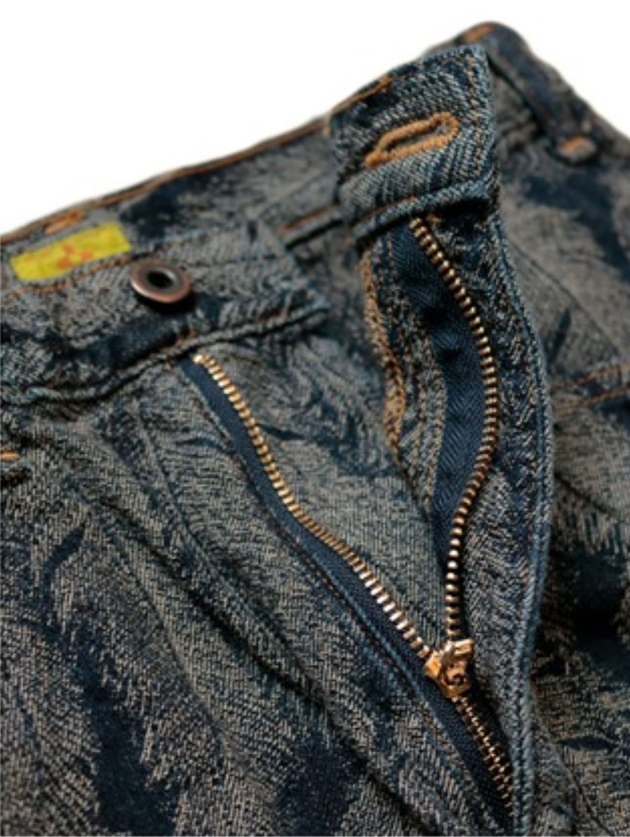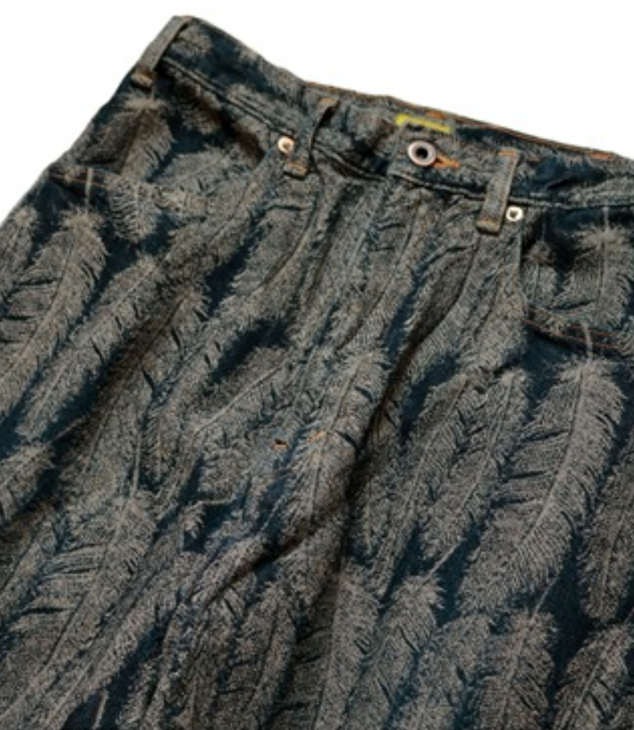 The Feather Denim Jeans is one of its own kind for Kapital also as there is no patchwork and embroidery used to develop this collection. A denim jacquard item tailored with a three-dimensional and luxurious feather motif has appeared. Feathers designs are all over on the pieces in different patterns with asymmetric edges. The collection features Jackets, Shirts, Shorts, Denim Bag and a beautiful coat. Jacquard denim has been there for a long time but it is the interpretation that a brand gives to it that makes the difference. Let’s check out how Kapital has used jacquard fabric to give their own unique stamp.