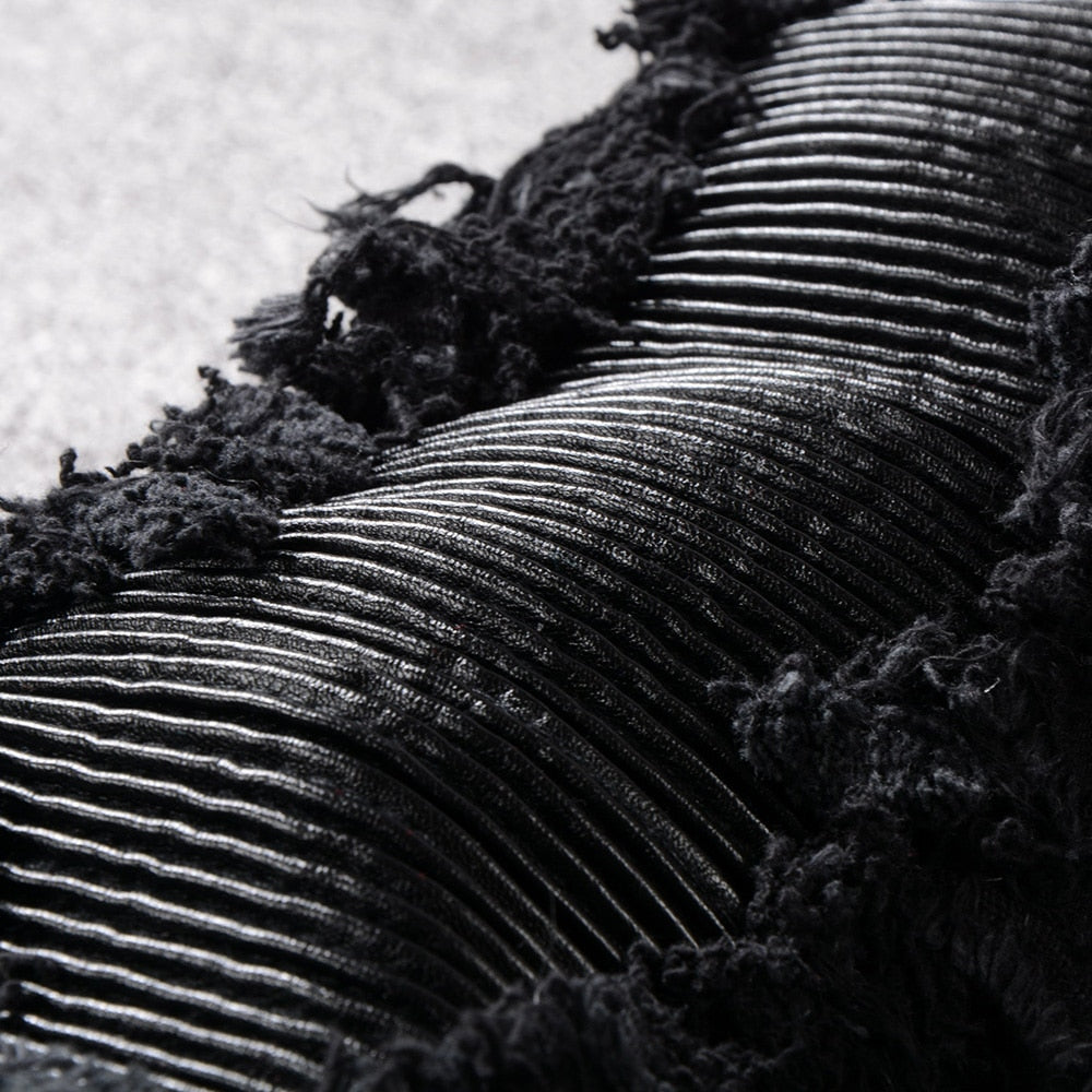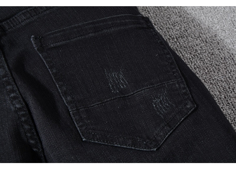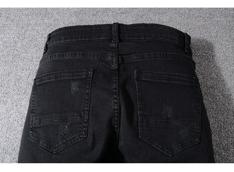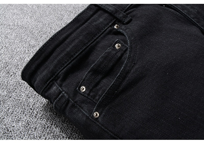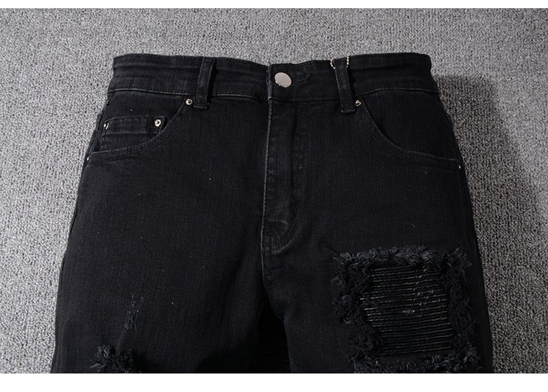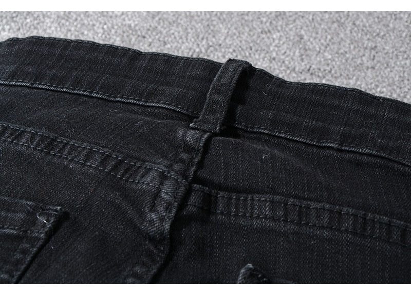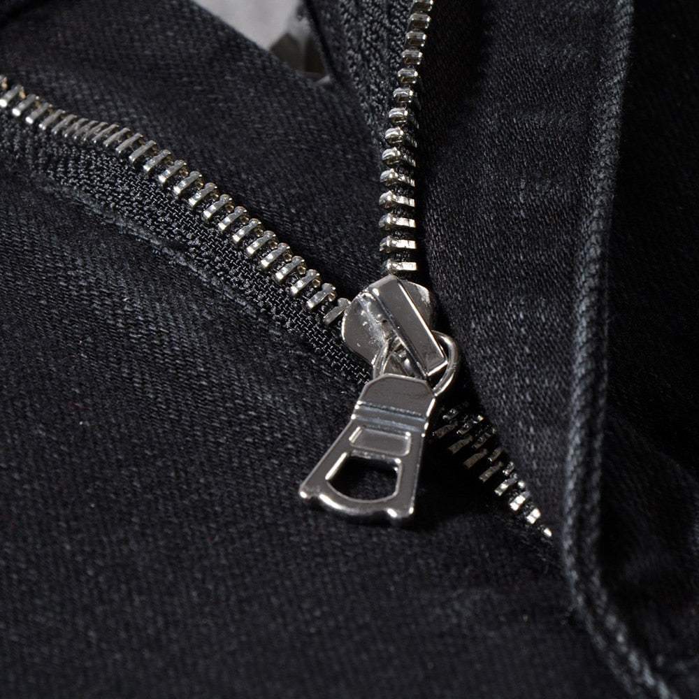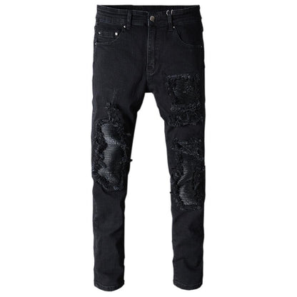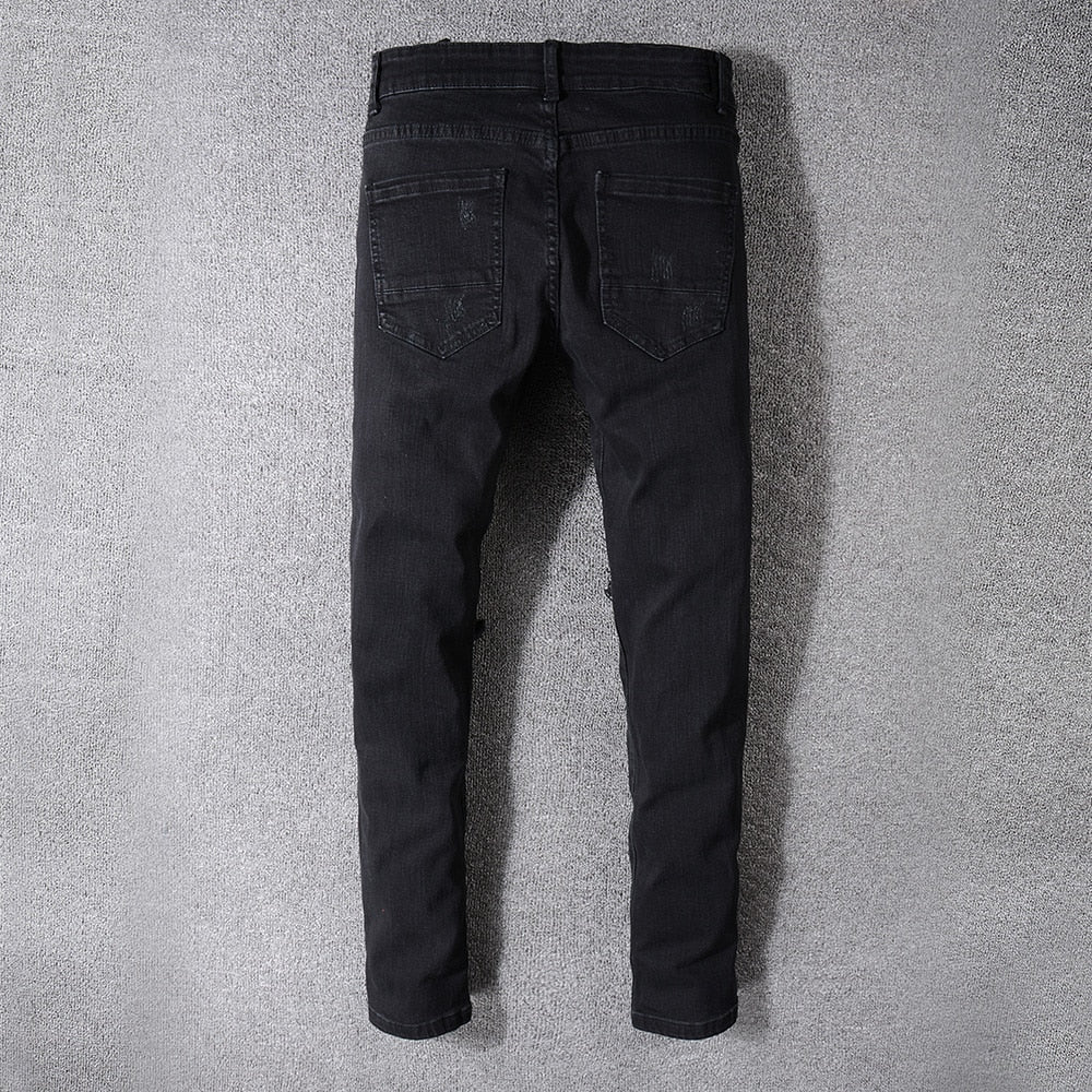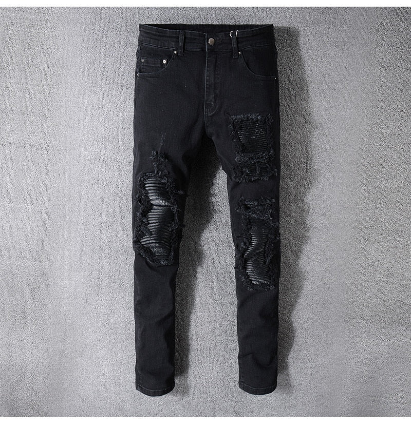 This rock 'n' roll-inspired designs featuring slim cut in a signature skinny fit, these stretch-denim jeans are distressed by hand but keeping in a solid black color and ribbed leather inserts on both knee and left thigh panel that give them a cool moto feel.