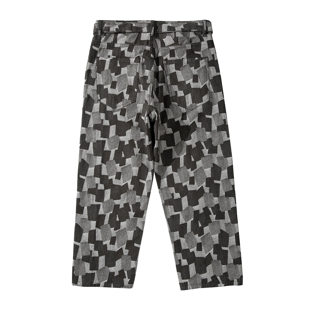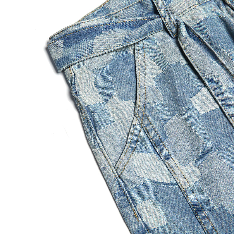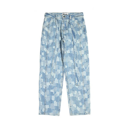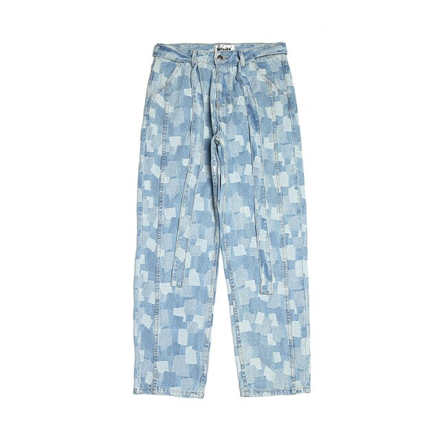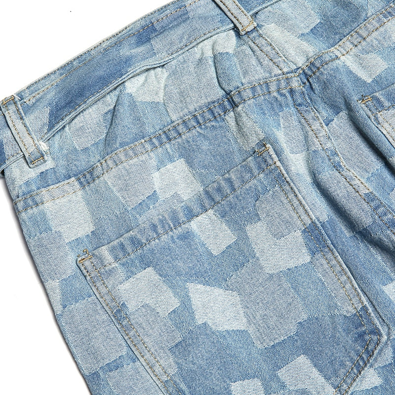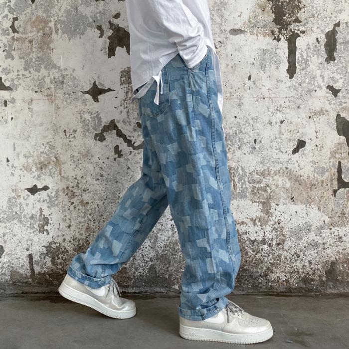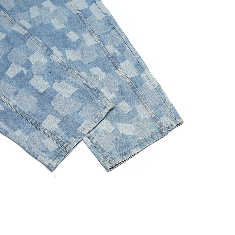 Straight Legs Compressed Patch Denim Jeans featuring new heat-compress technology creates patch patterns that call to mind a bit of vintage styles from the 60s with the modern touch. An elevation to feel timeless. Tonal match-pattern denim drawstring at waistband. They’re cut for a relax fit in multi shades of light and medium blue washes and whiskered through the whole piece. Since this piece gives you a more casual and street style fit and feel, a loose fit long sleeves tee to enhance the casualty to its fullest.