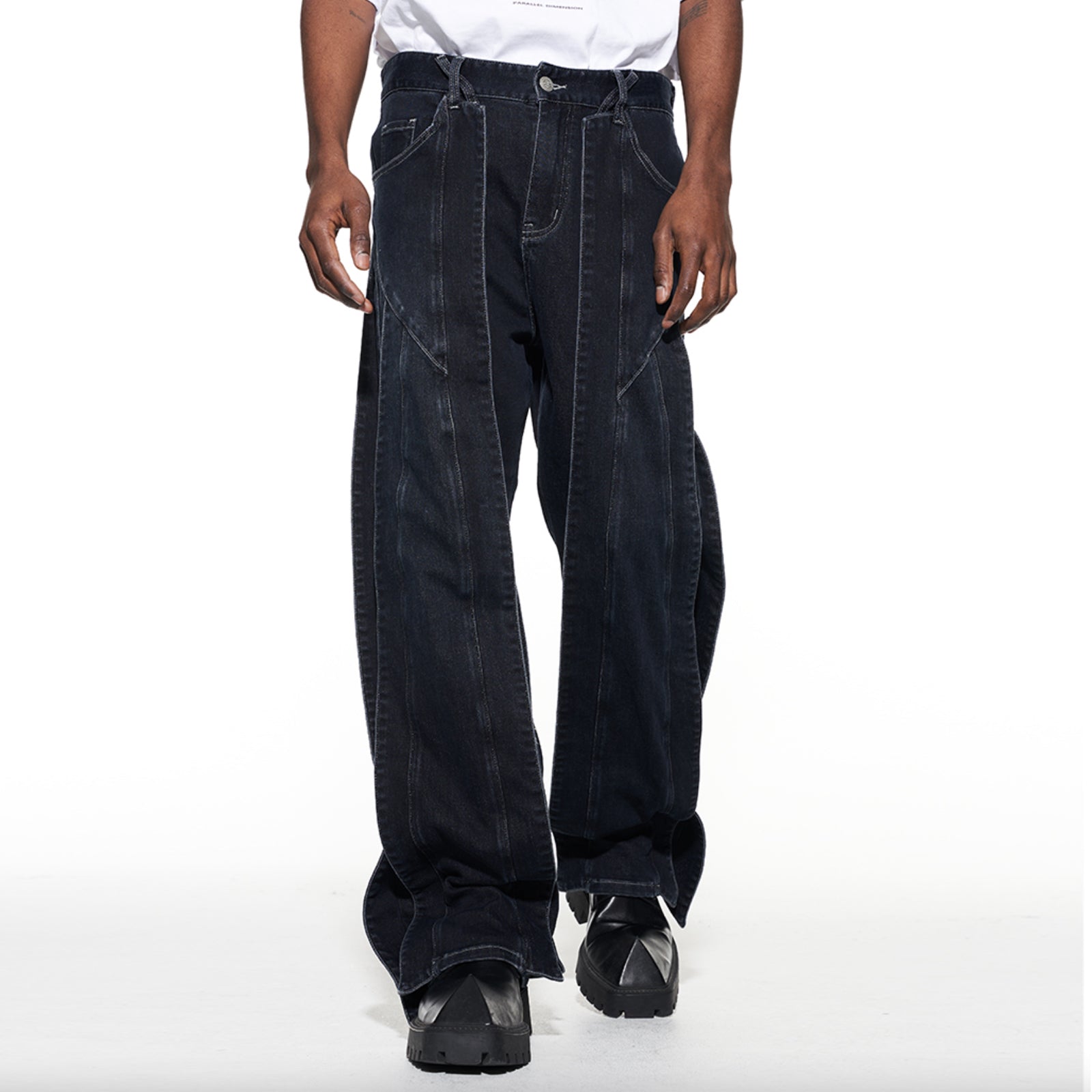 MULTI-LAYERED PANELS BAGGY DENIM JEANS - BLACK
