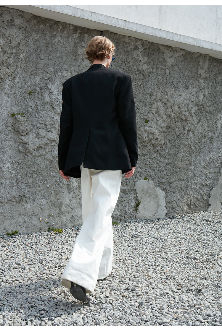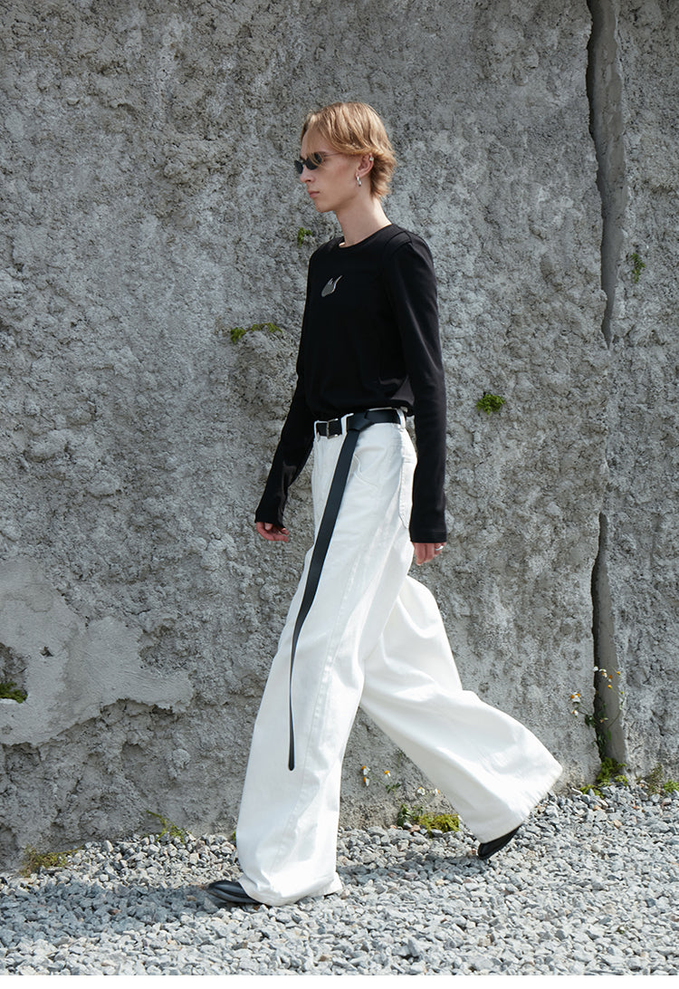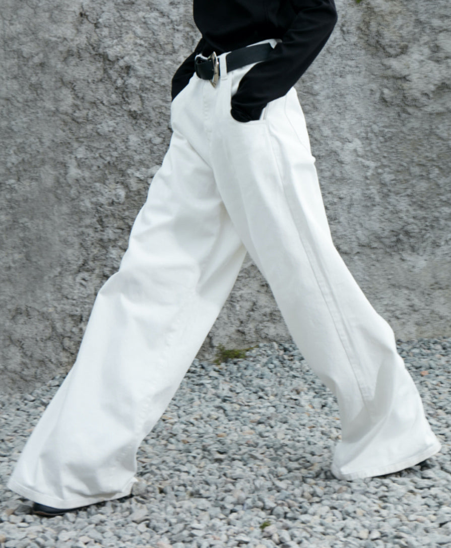 • Ample à la cuisse, droite et légèrement trapèze vers la cheville