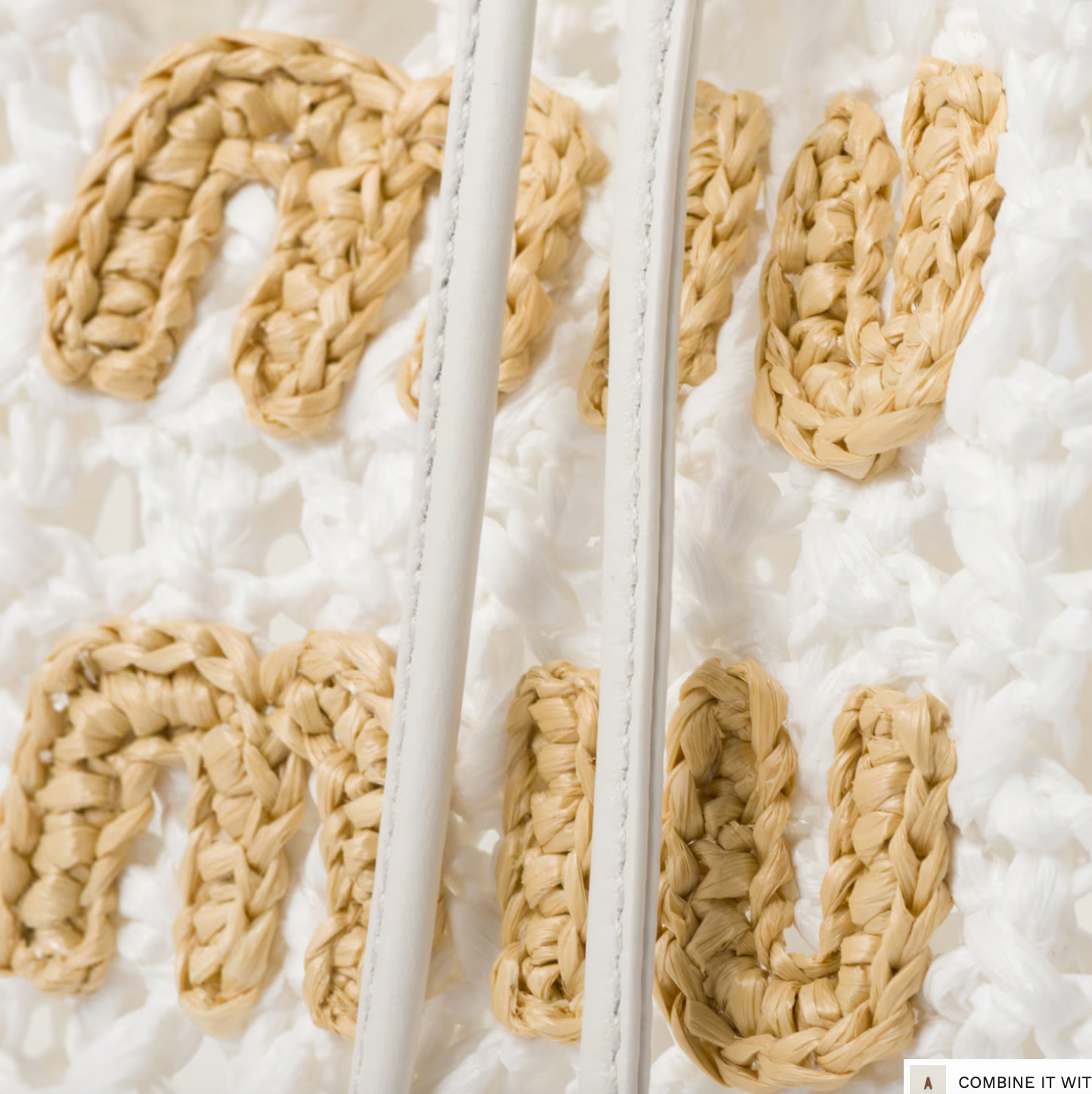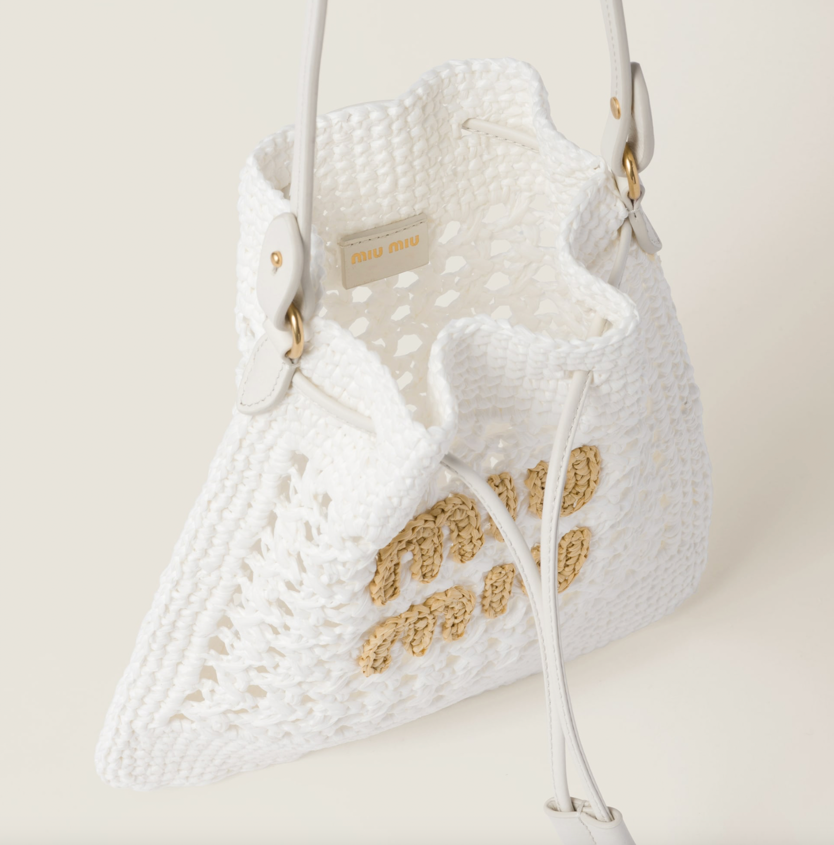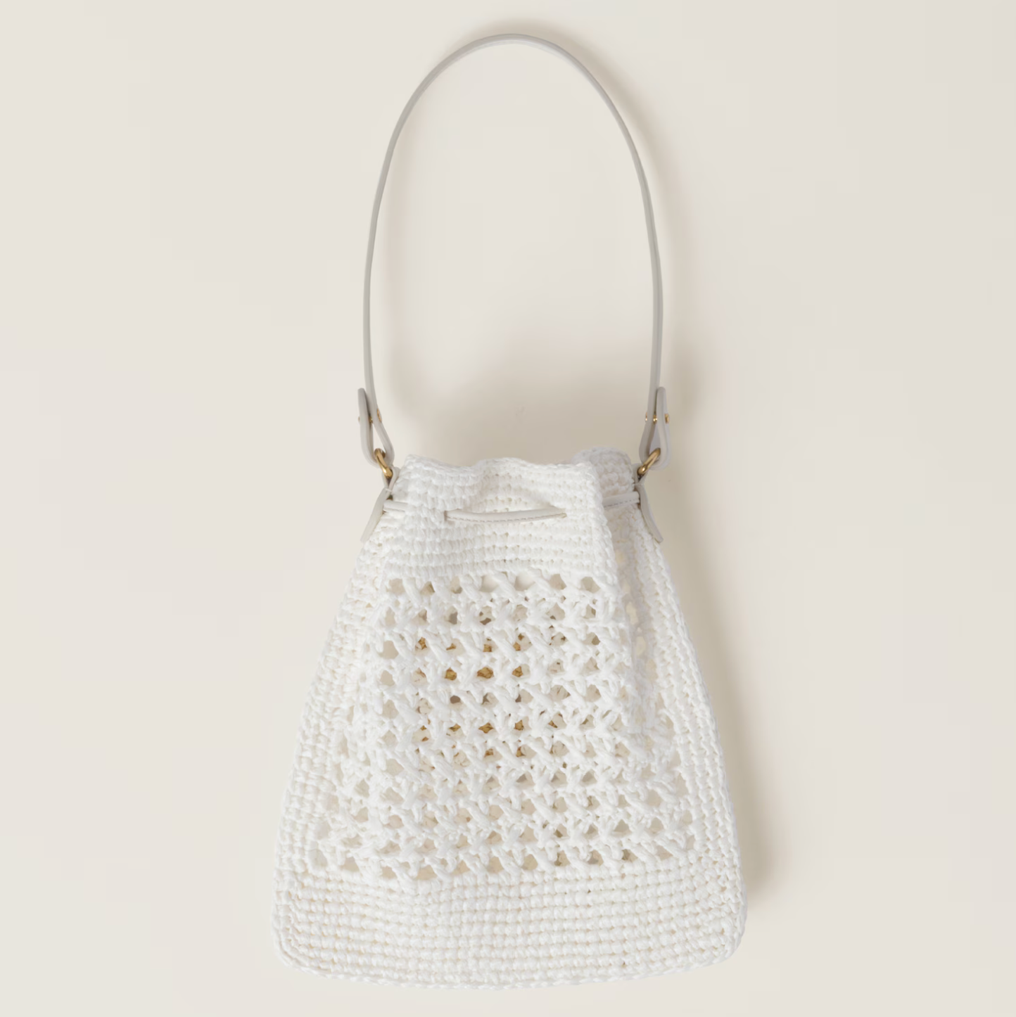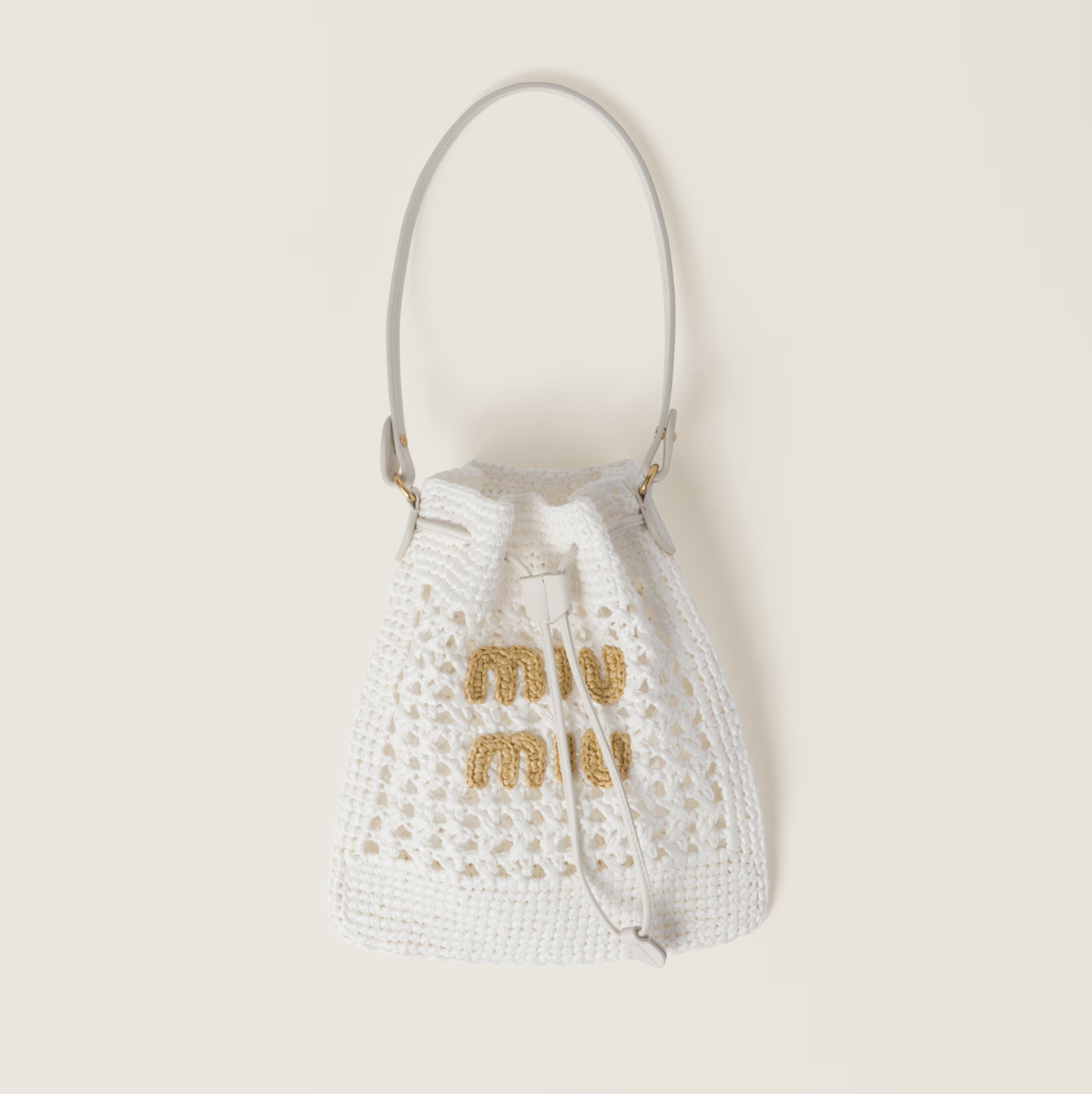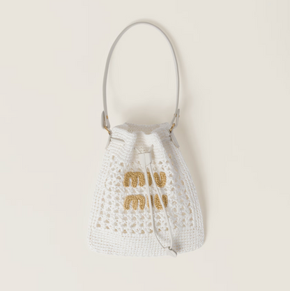 An exotic and refined design characterizes this mini-bag made of woven fabric. The Miu Miu logo stands out thanks to its immediate iconic character while the leather handle and drawstring complete the style with a refined contrast.