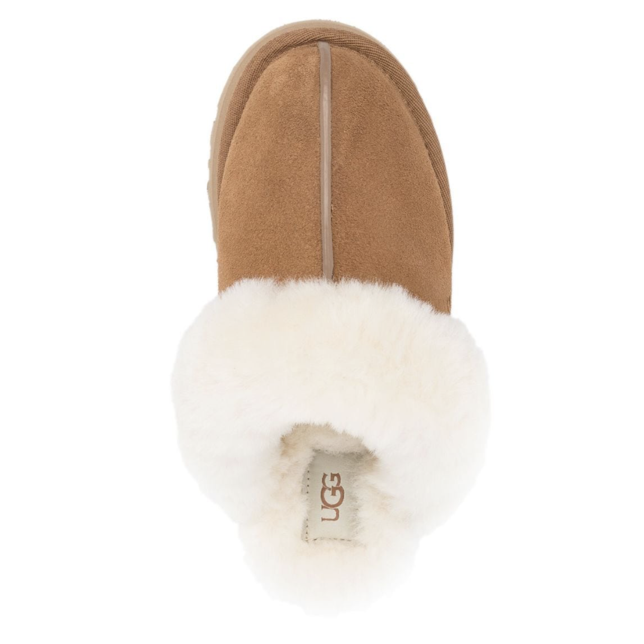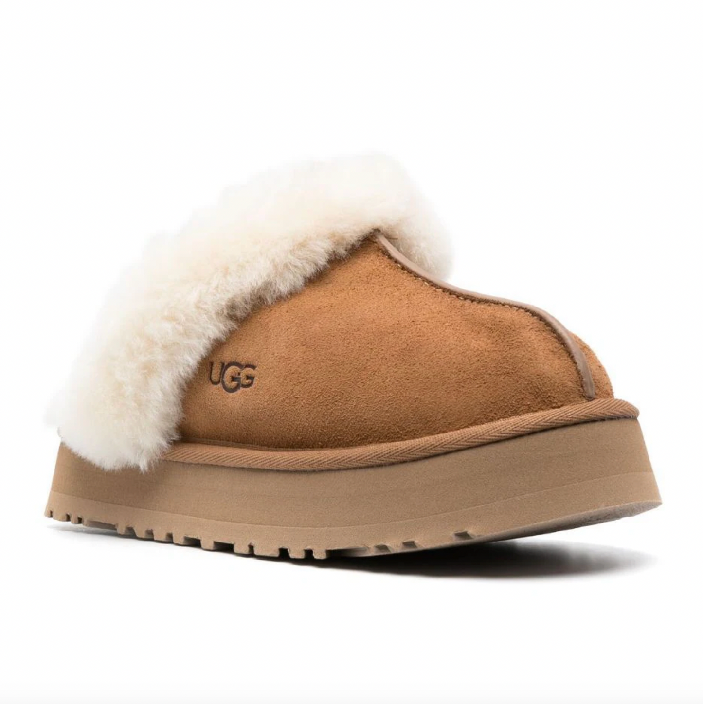 Beige suede Disquette suede slippers from UGG featuring slip-on style, shearling lining, platform sole, logo print to the side, round toe and branded insole.