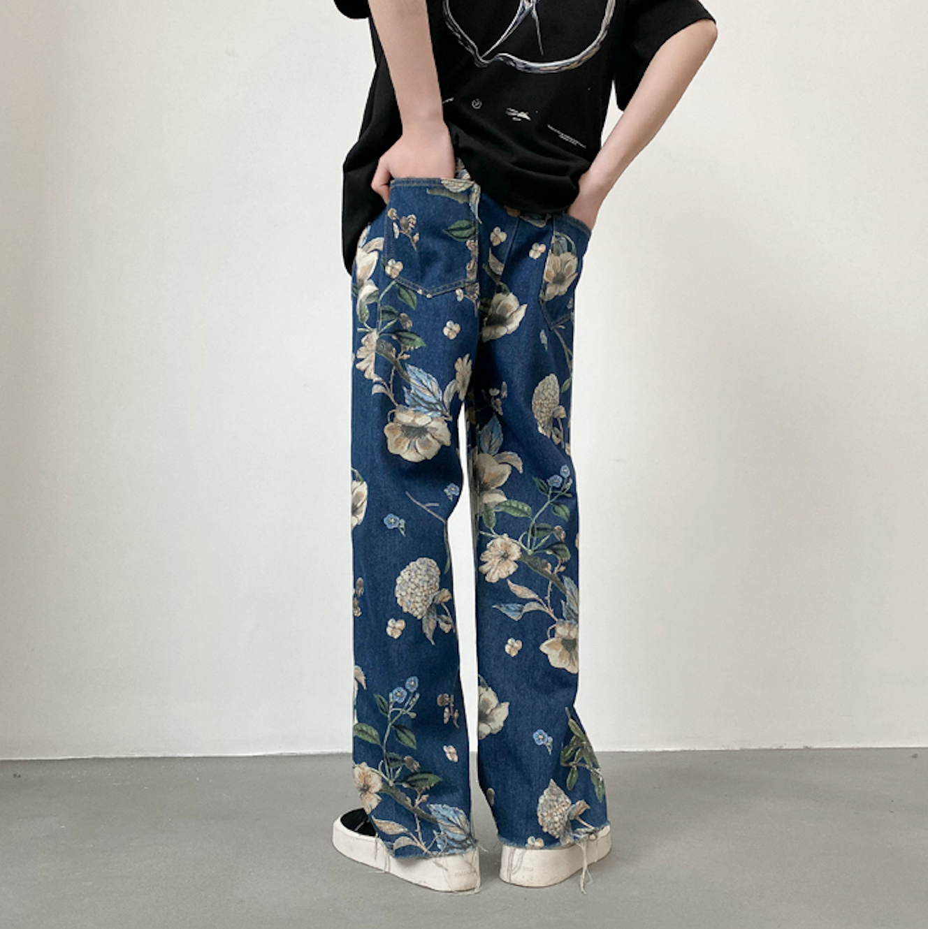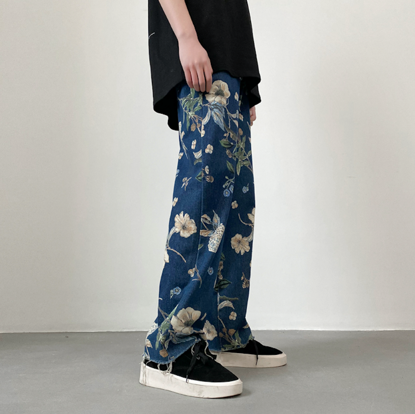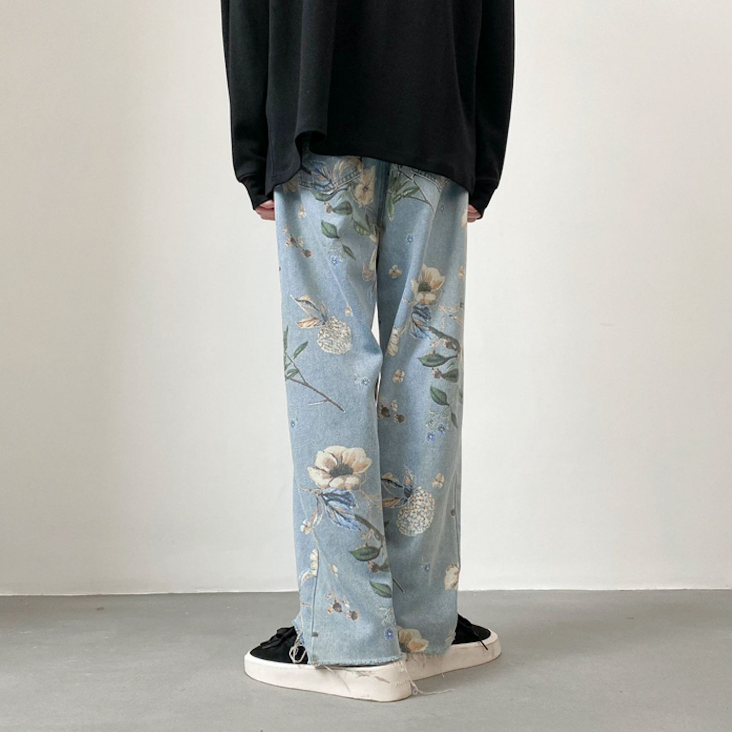Jean coupe ample en denim léger avec imprimé floral sur toute la surface. Cinq poches. Braguette boutonnée.