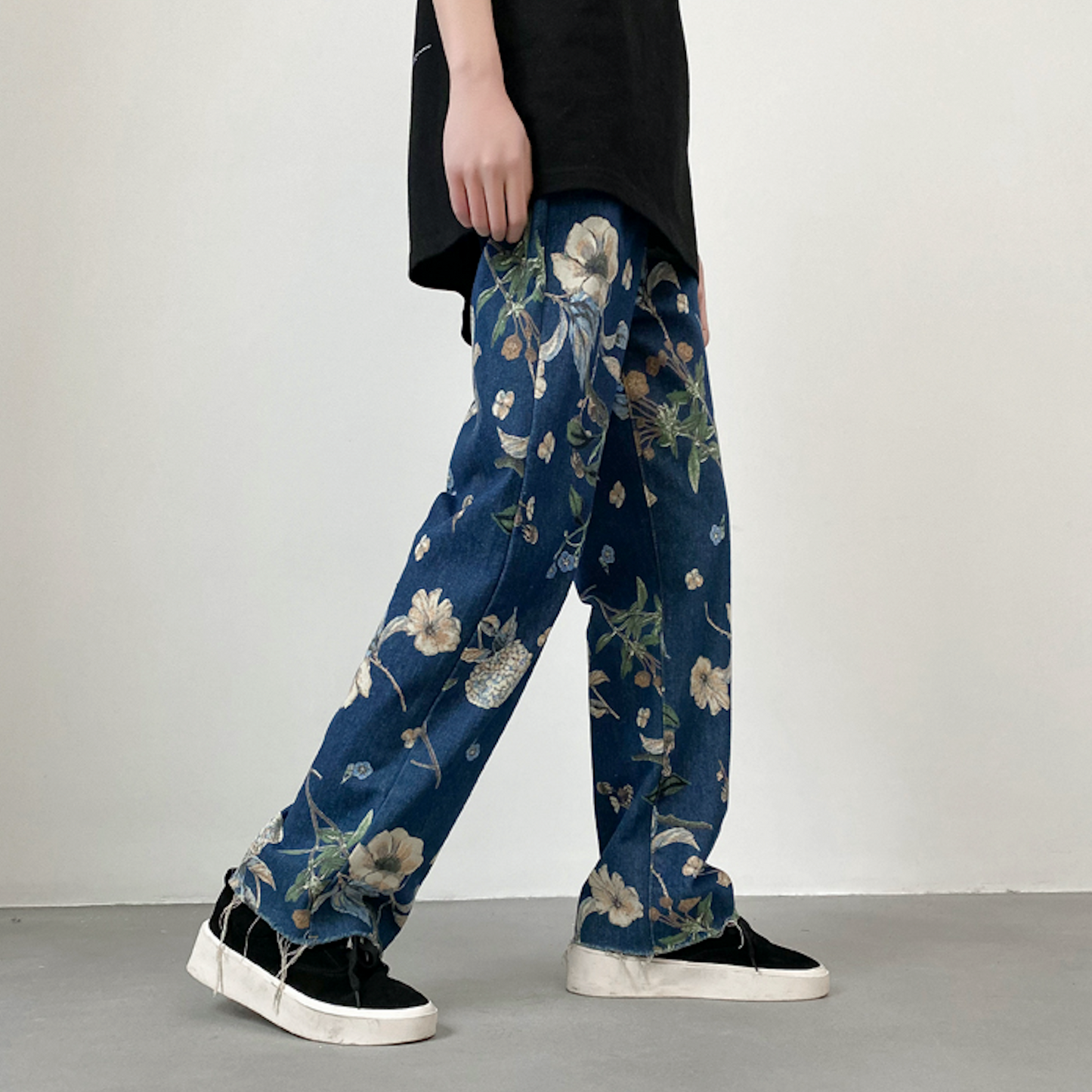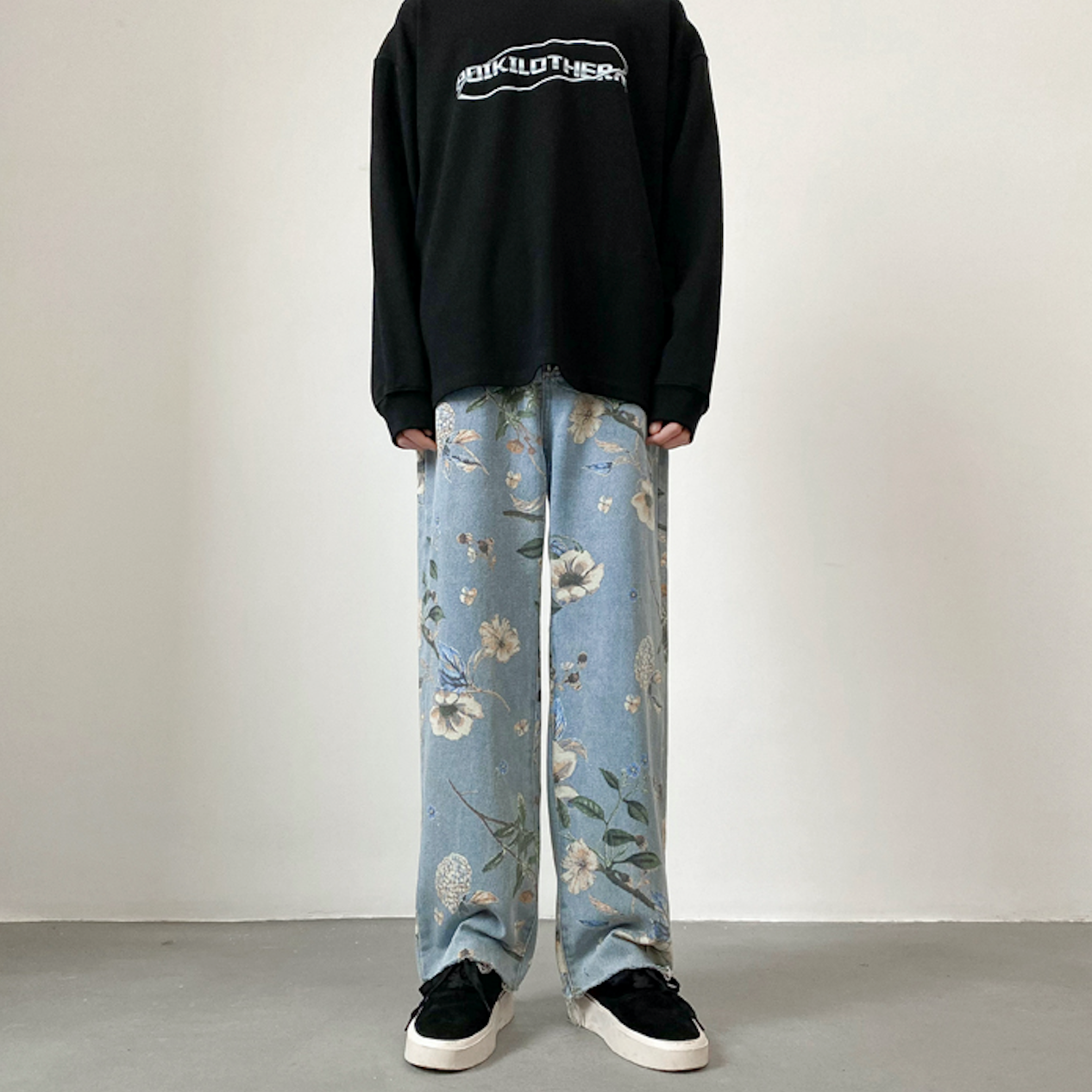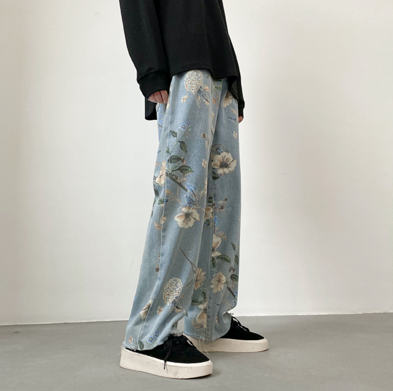 Jean coupe ample en denim léger avec imprimé floral sur toute la surface. Cinq poches. Braguette boutonnée.
