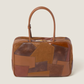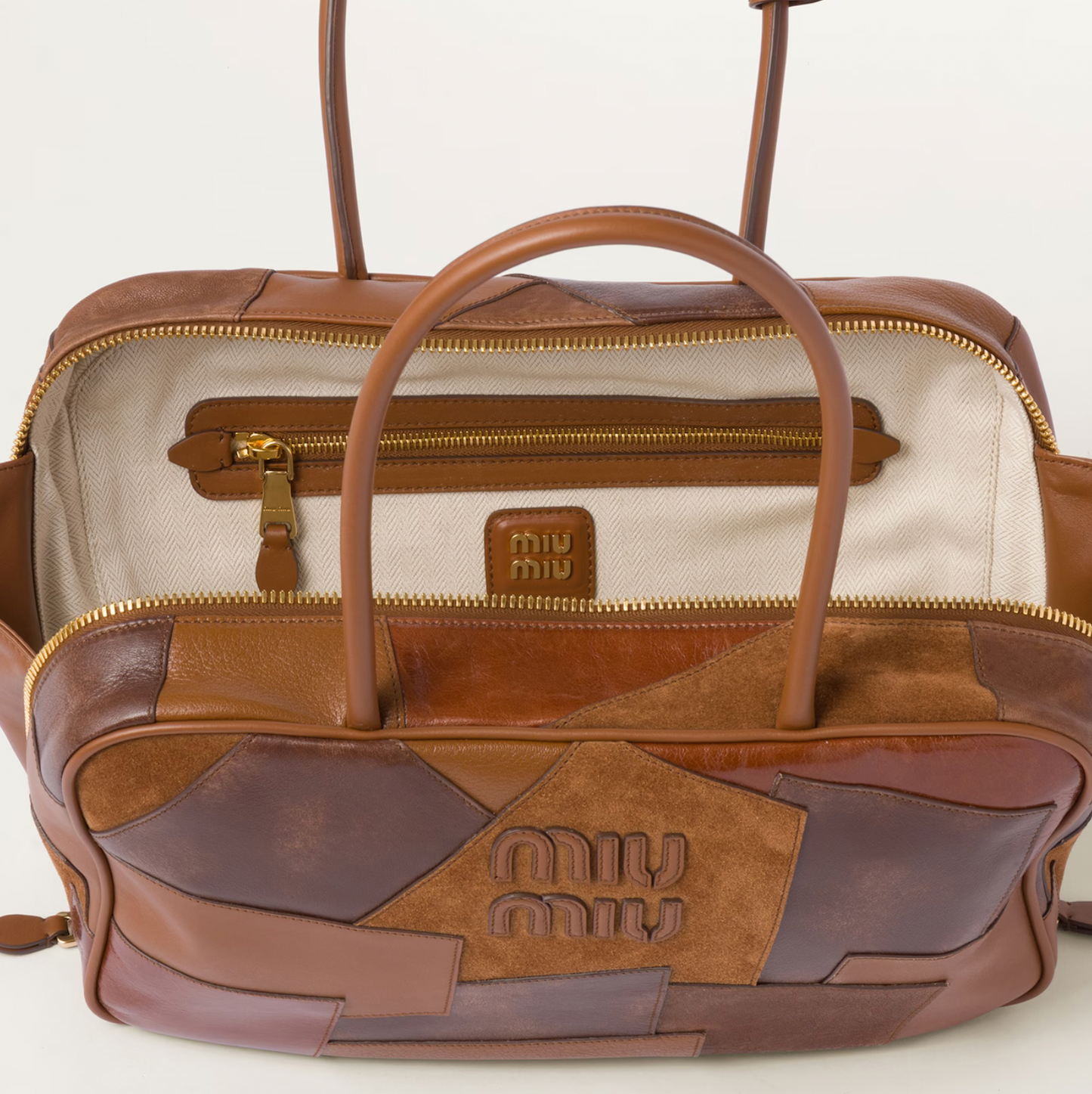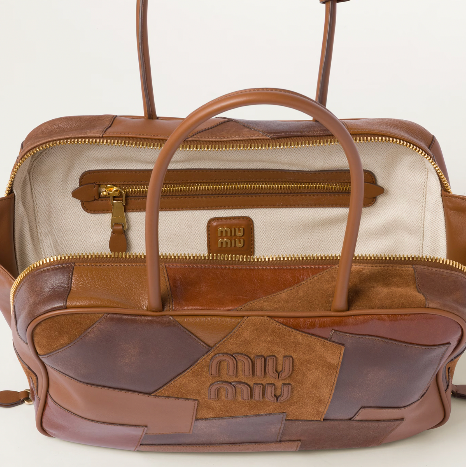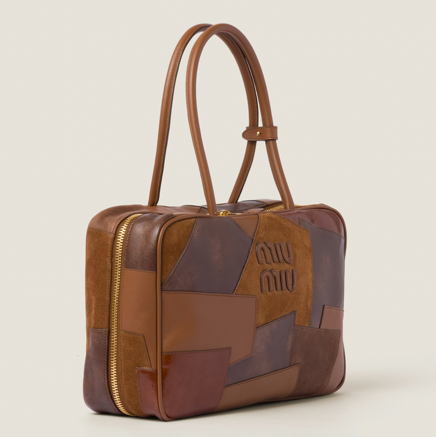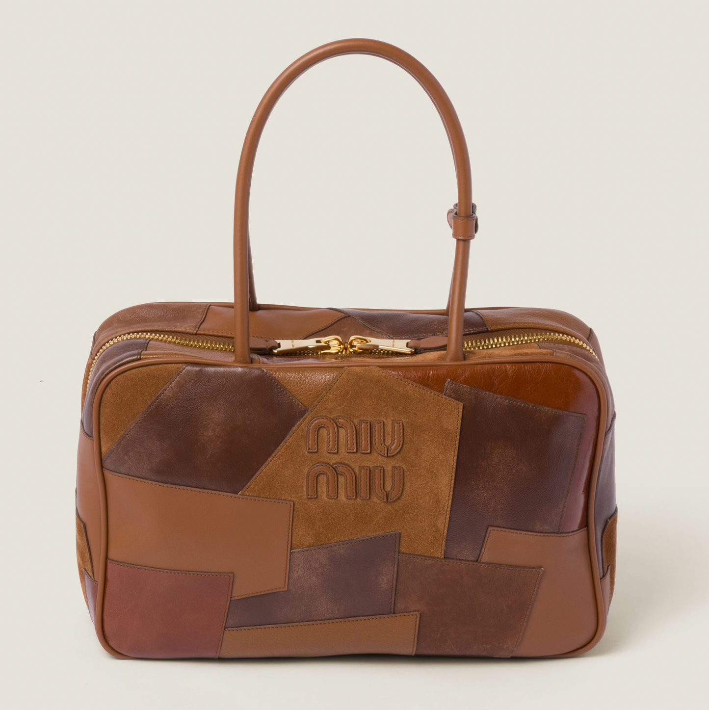 This leather bag is part of the Miu Miu Upcycled limited edition selection, born as a result of Miu Miu's interest in conscious fashion and circular design practise with the aim of giving new life to vintage garments, bags, and accessories that have been redesigned and reworked. The bag repurposes materials from past styles that are carefully stitched together with great care and attention to the structure, texture, and color to create something completely new. Distinctive elements are the refined patches, hand-stitched logo, and a deliberate vintage look.