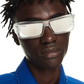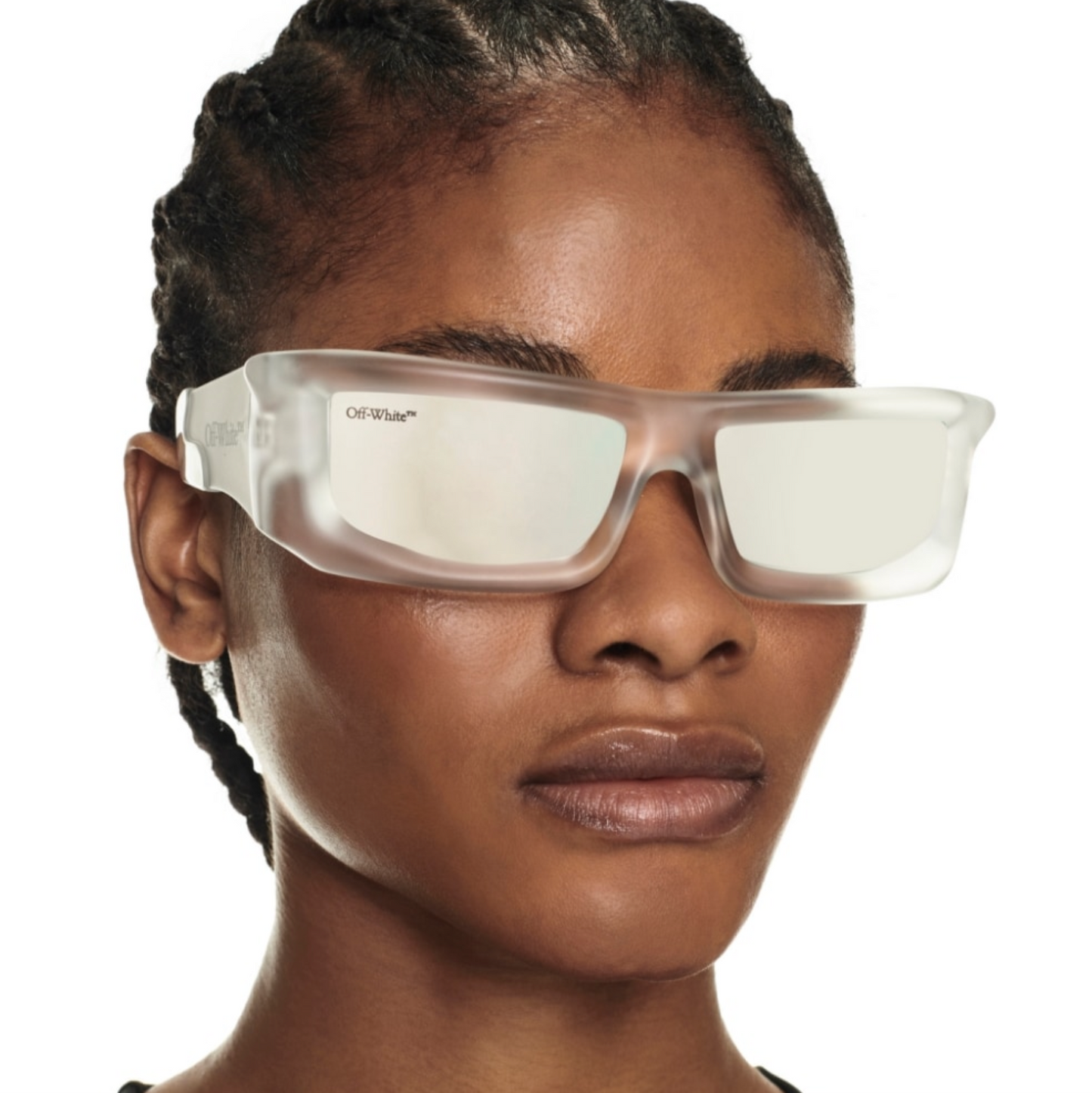 White sunglasses with rectangular shape and silver lens. Logo engraved on the lens. Tonal Off-White logo at side.