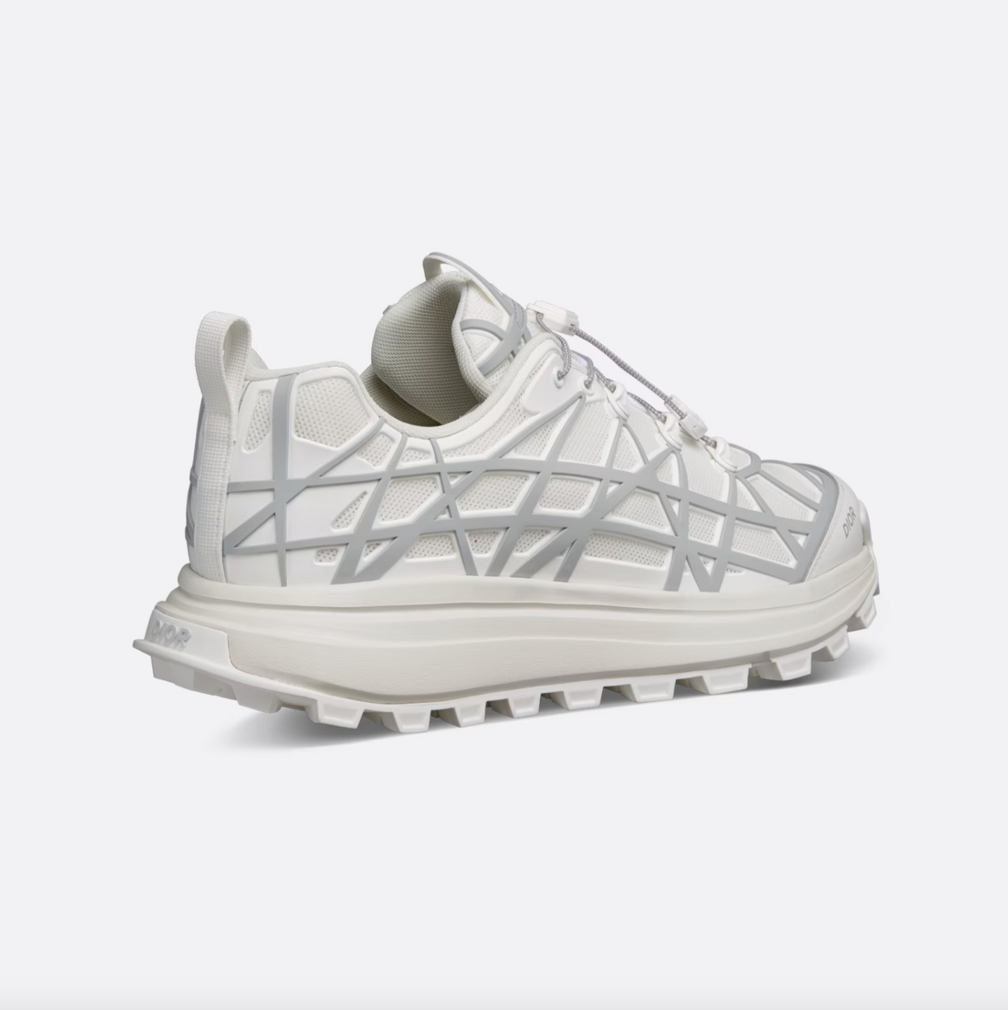 As seen at the Dior Men Summer 2023 fashion show, the season's new low-top B31 Runner shoe is distinguished by its modern silhouette that combines technical expertise with the House's couture spirit. Crafted in white technical mesh, it is enhanced by gray Warped Cannage injected rubber in a futuristic new take on the House's iconic motif. The Dior signature adorns the tongue and front, while eyelets recall a hiking shoe and the CD Diamond drawstring cord accentuate the piece's technical appeal. The thick notched sole in sculpted rubber offers ideal traction, and the reinforced heel guarantees optimal comfort. The B31 Runner sneaker will complete both sportswear and casual outfits alike.