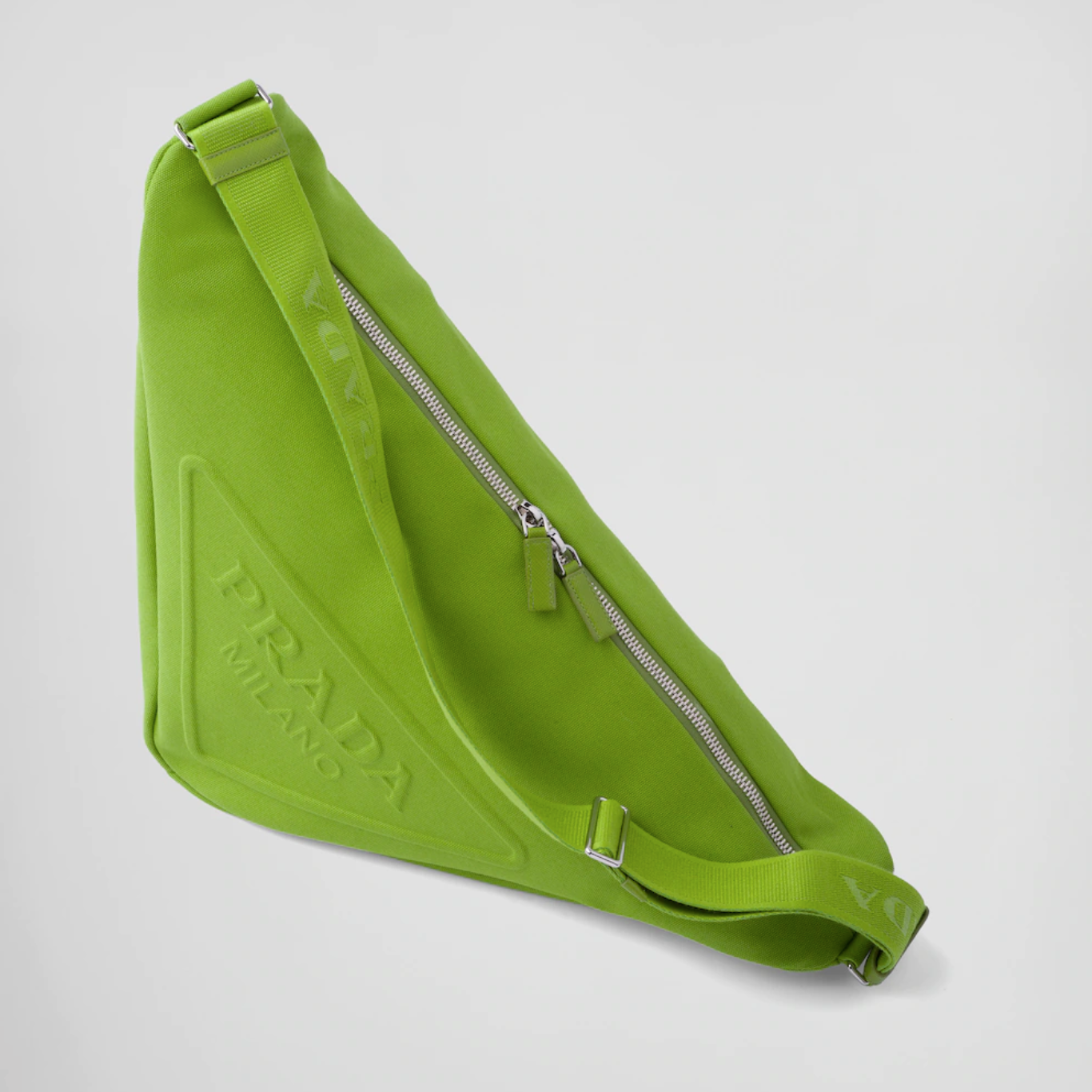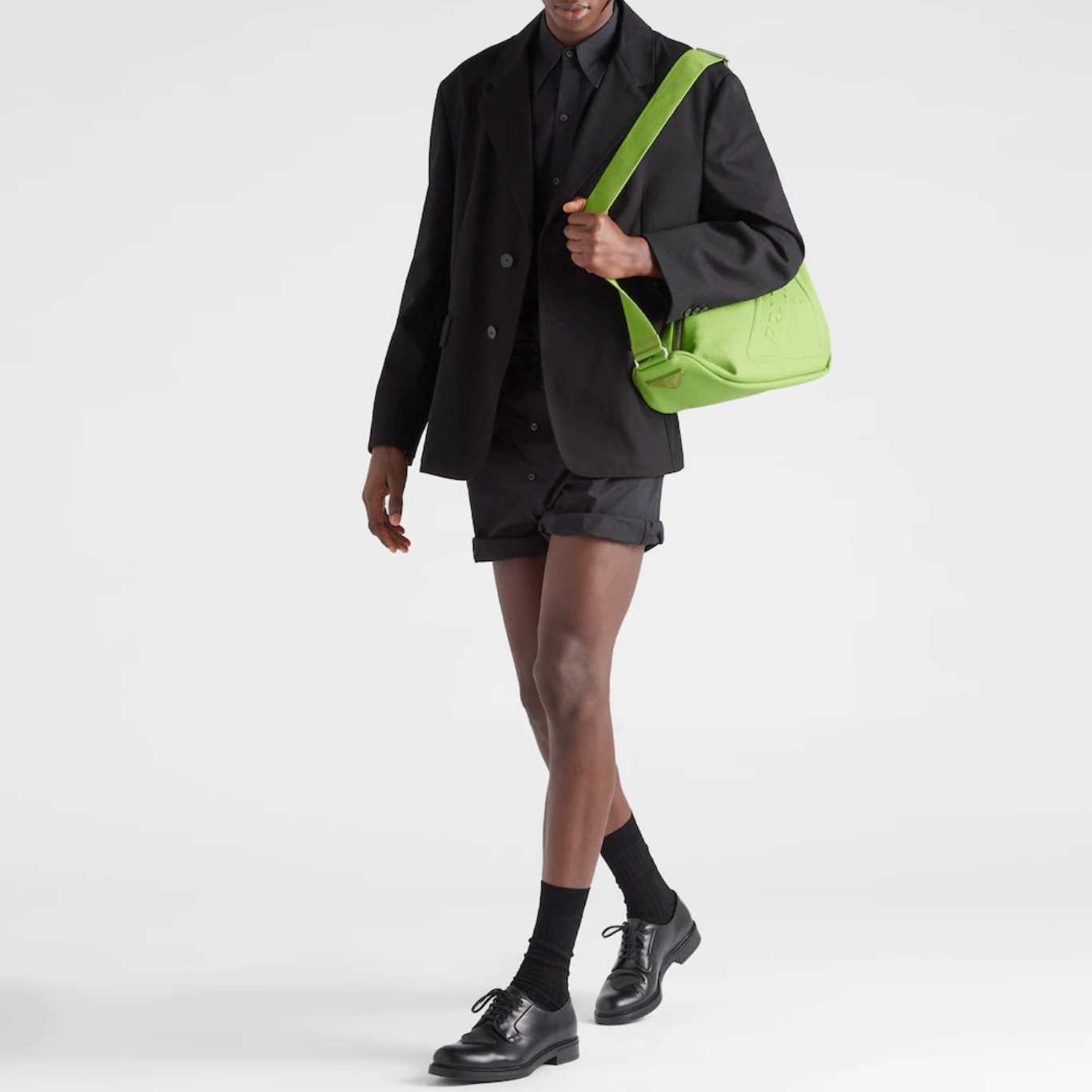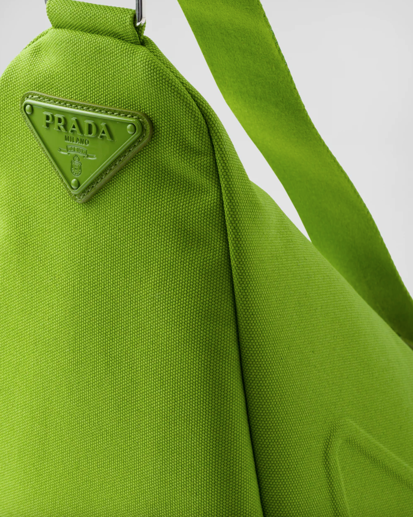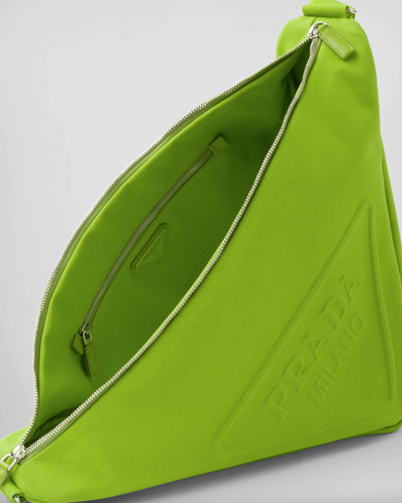 さまざまな方法で着用できる調節可能なショルダー ストラップが特徴のこの汎用性の高い三角形のキャンバス バッグは、プラダのアイコニックな幾何学的なロゴを新しい方法で再考し、繊細なトーンのディテールを特徴としてモノクロームの 1 つの素材の効果を生み出しています。