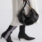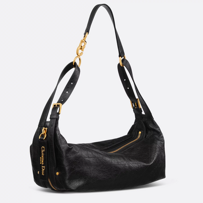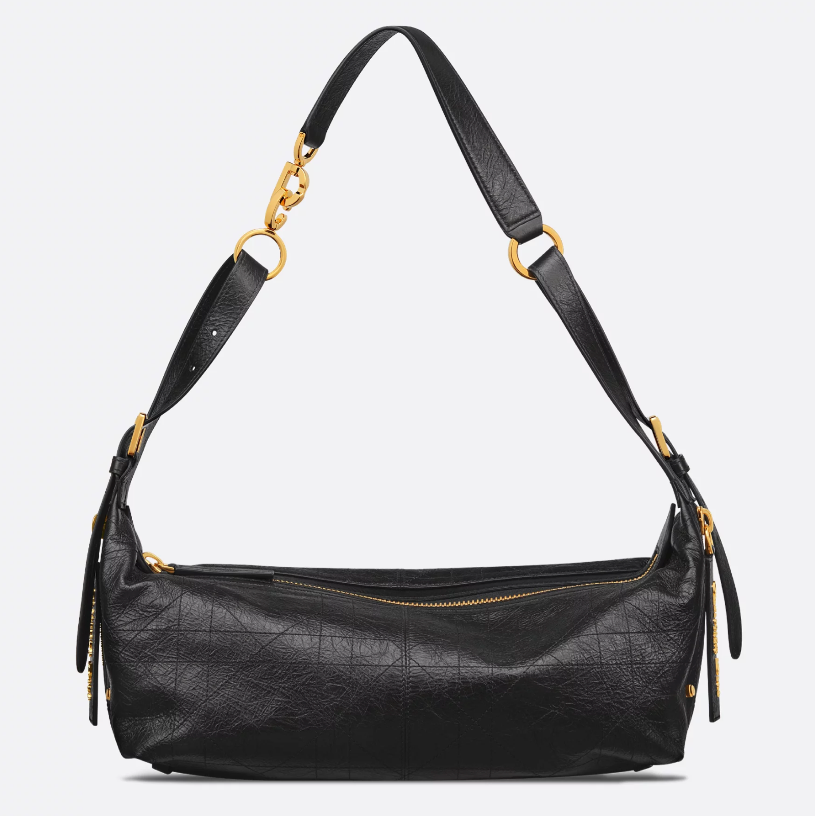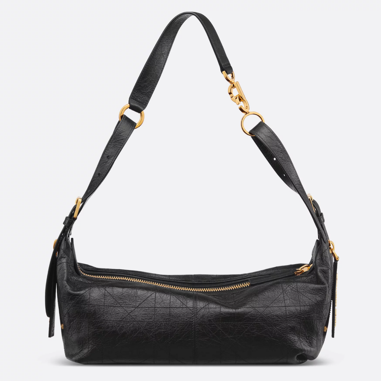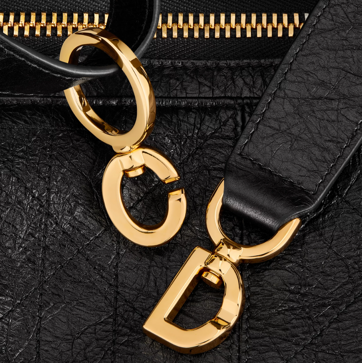 New for the season and presented at the Spring-Summer 2025 Ready-to-Wear Fashion Show, the D-Journey bag offers a new take on the hobo silhouette with a modern supple design. The style is crafted in black crinkled calfskin with Flat Macrocannage topstitching in an interpretation of the House's iconic motif. The main compartment is completed by a zip pocket, while two decorative side pockets showcase a large leather pull with the Christian Dior Paris signature. Featuring adjustable leather top handles and a leather strap, the medium D-Journey bag can be carried by hand, worn over the shoulder or crossbody as a daily companion.
