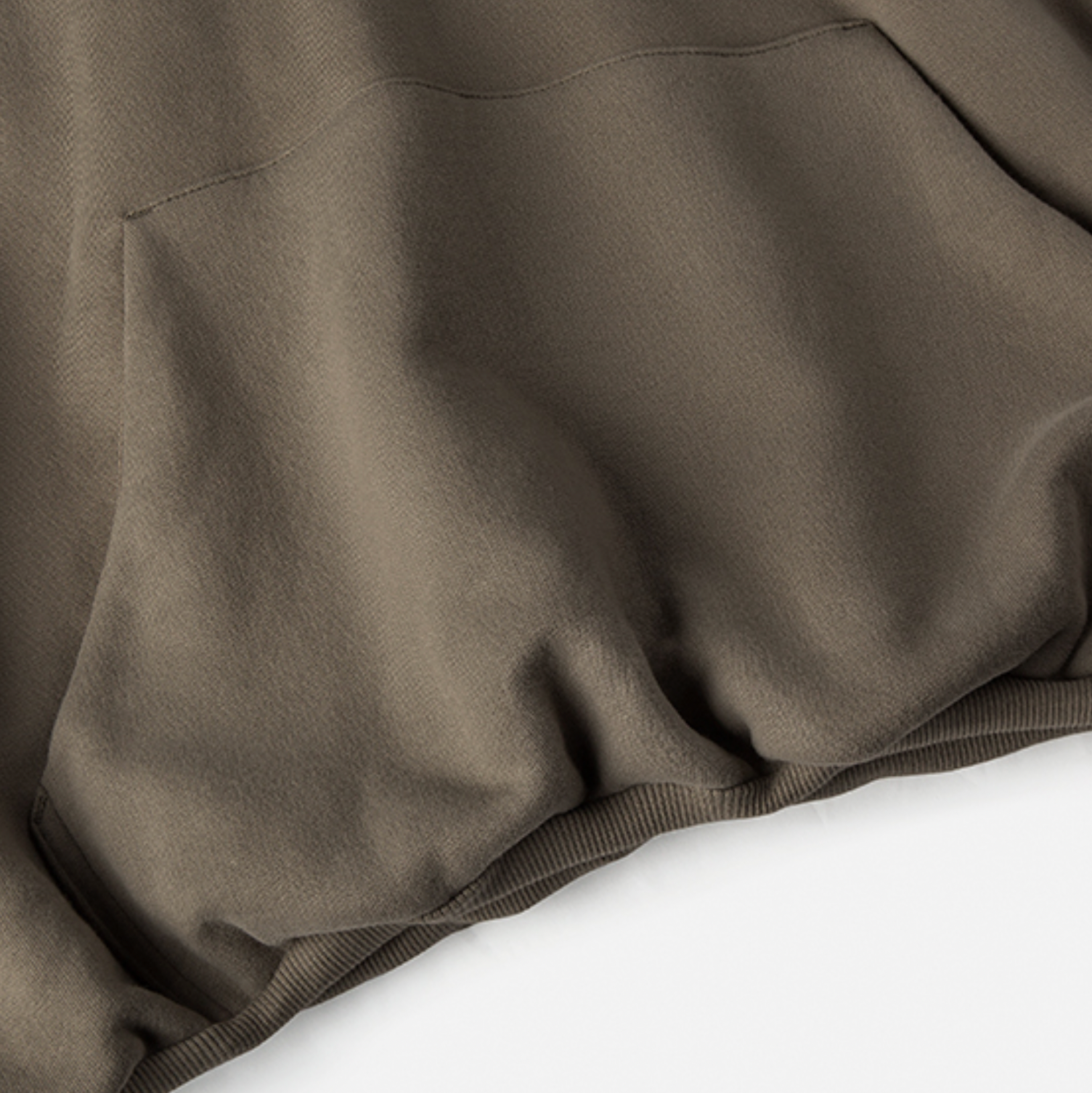 The Double Layer Hoodie features a relaxed fit with a dropped shoulder design, front pouch pocket, ribbing at the wrists and waist, and finished in both a washed and brushed double layer french terry fabric.