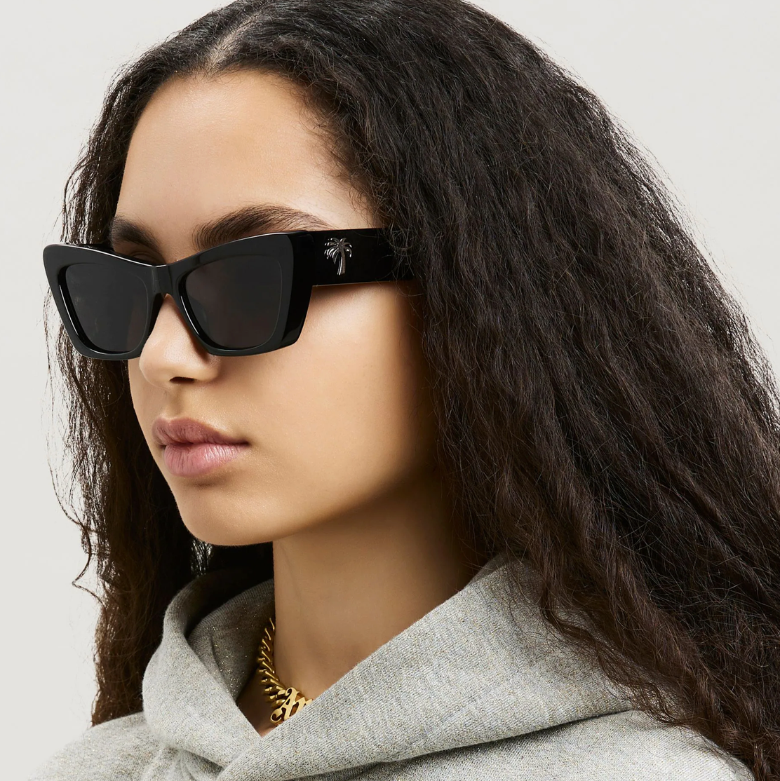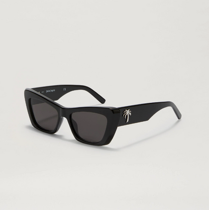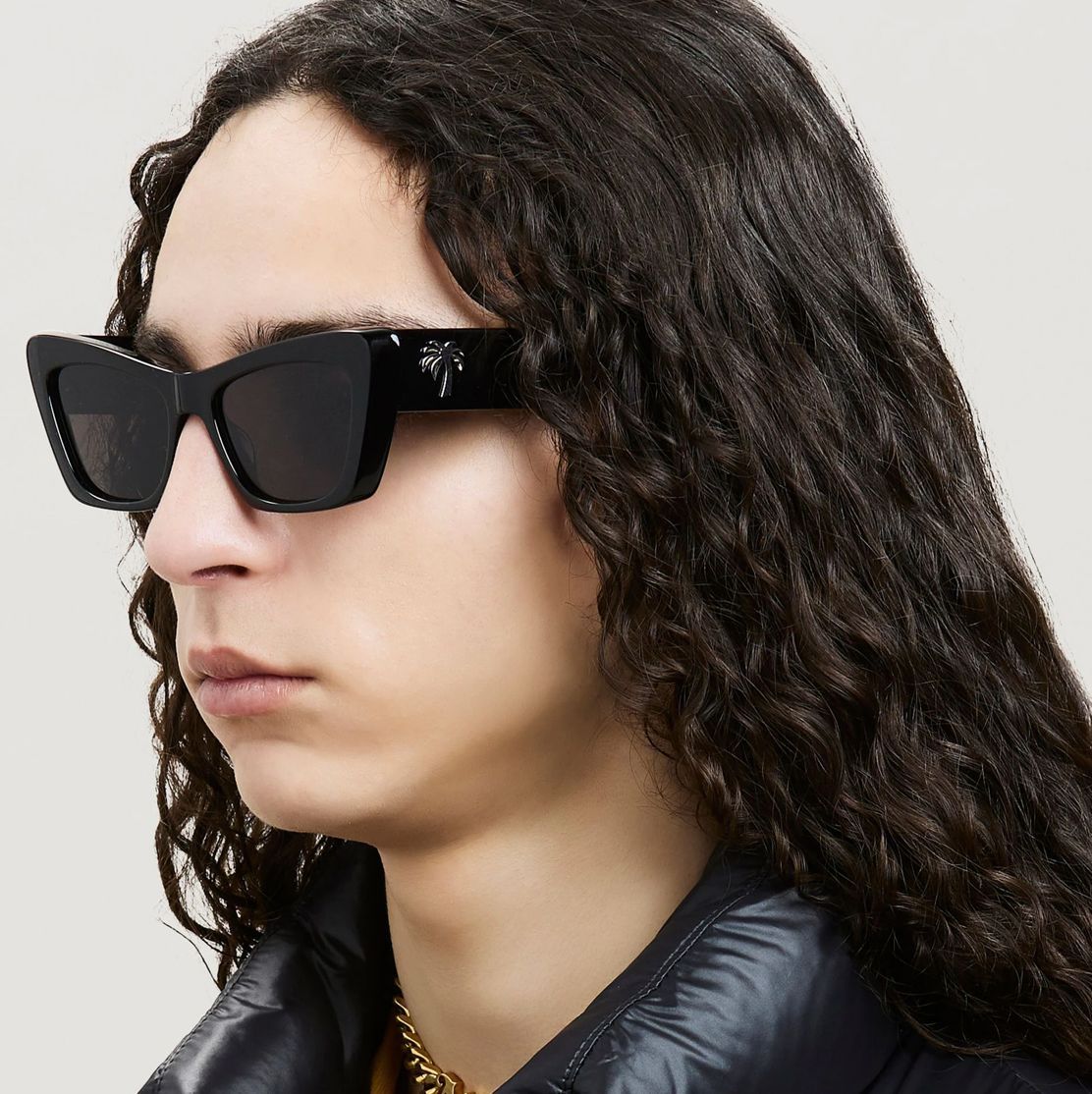 Rectangular sunglasses in black with black lenses. Silver Palm Tree logo at sides.