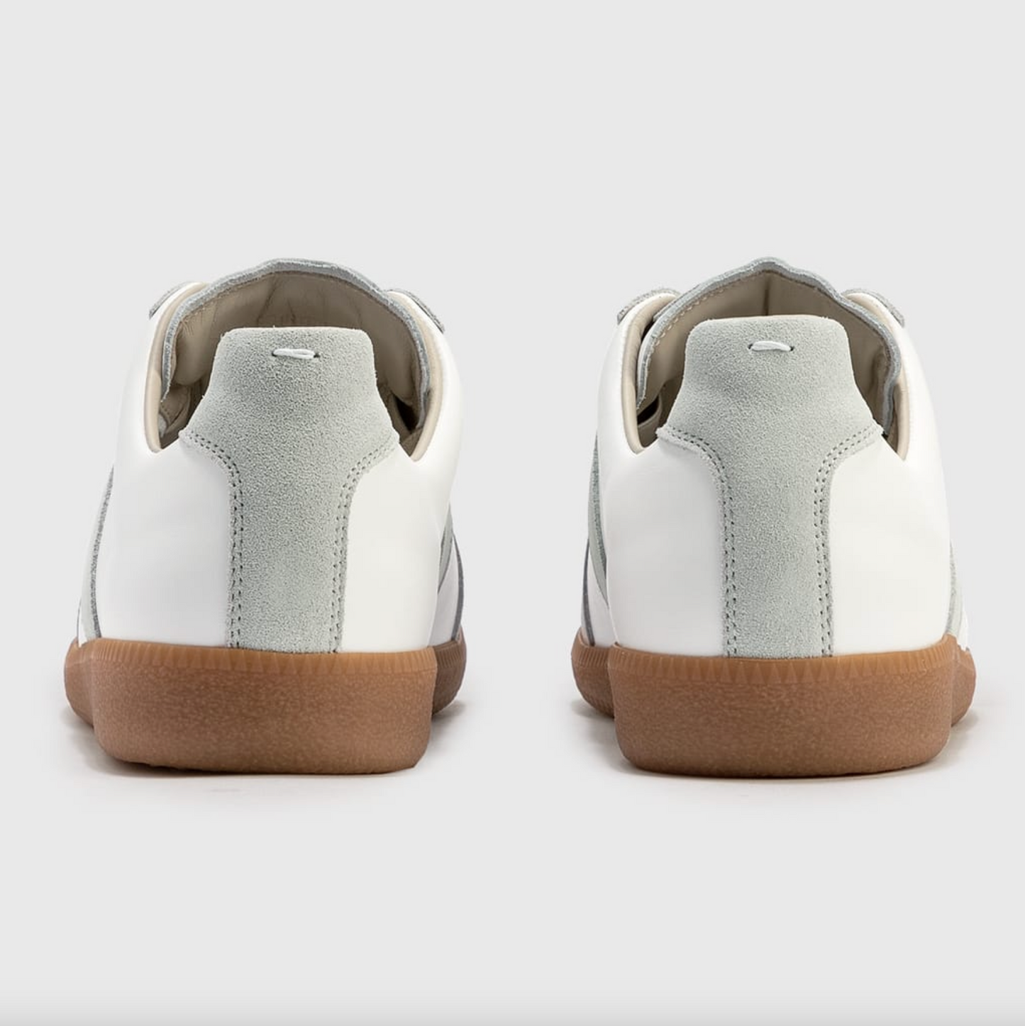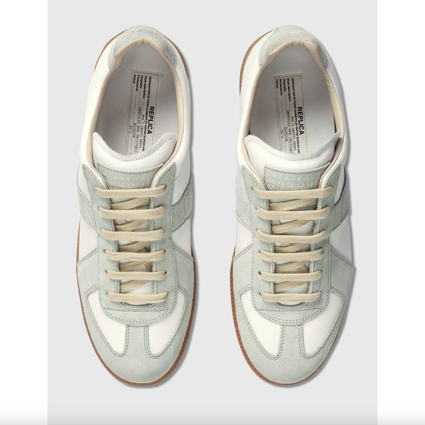 The Replica sneakers in nappa leather and suede with a honey sole. The Maison's iconic Replica sneakers are inspired by Austrian sports shoes from the seventies. Details on the Replica pairs are continually reworked in line with the season's inspirations.