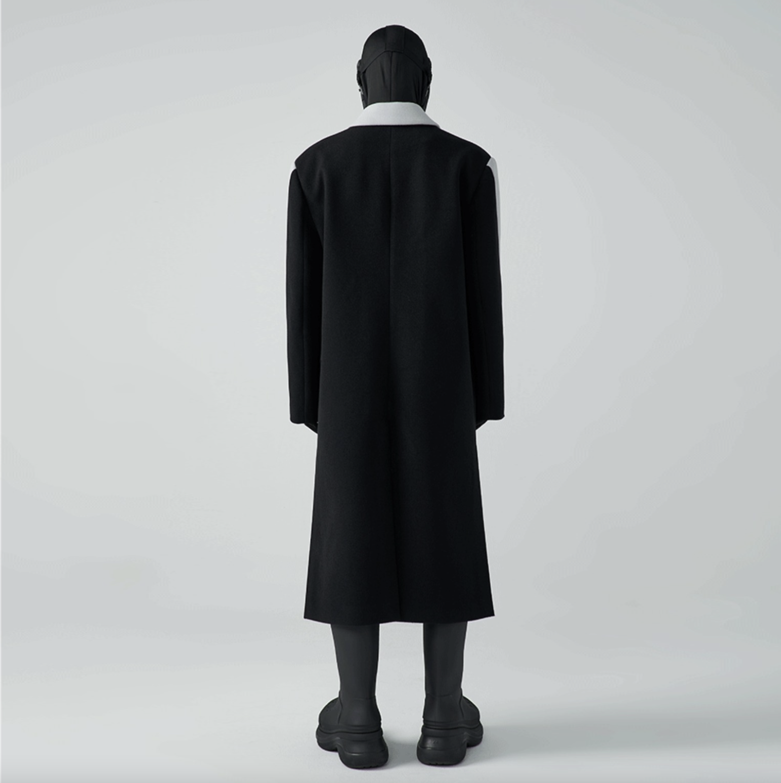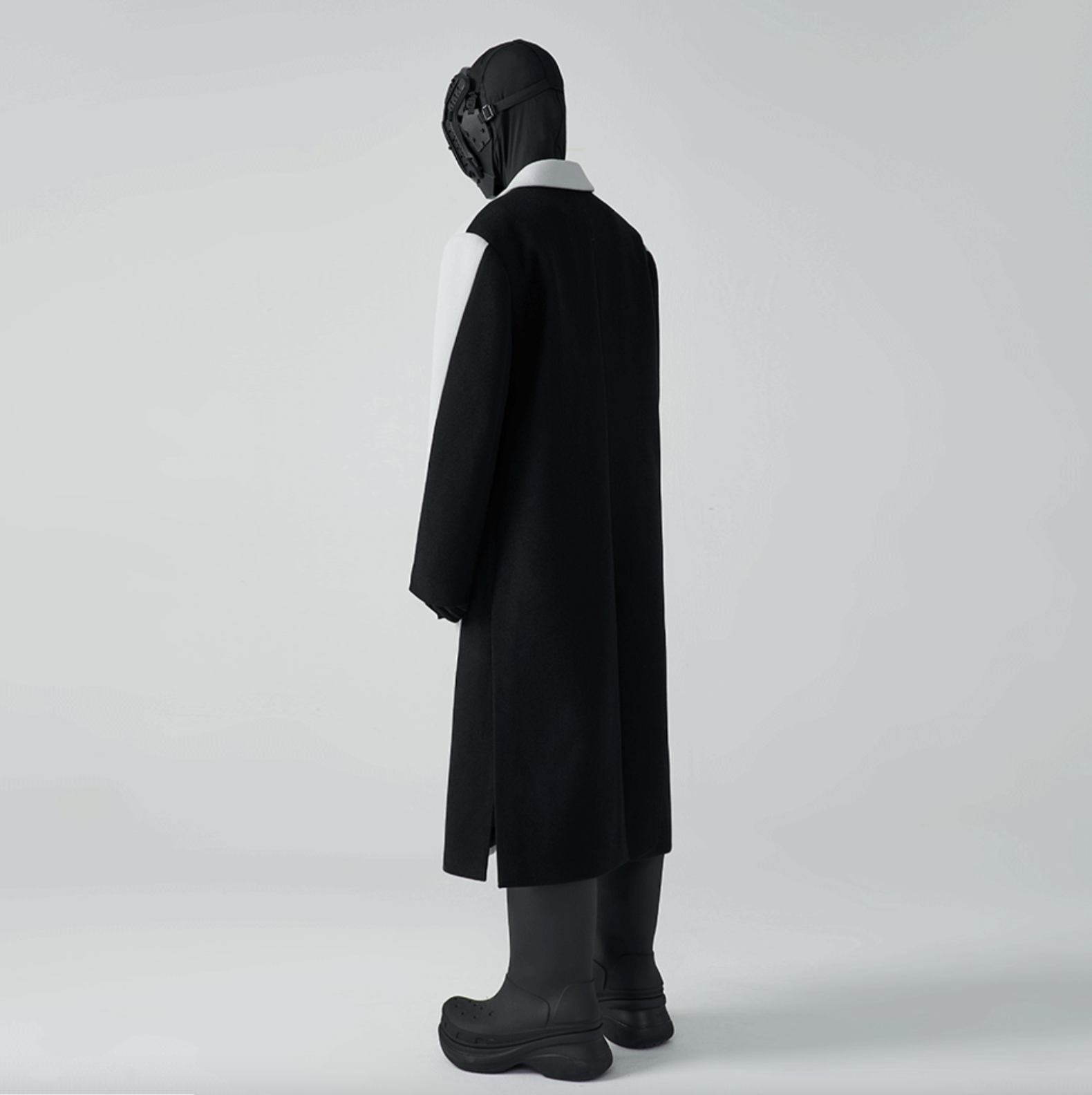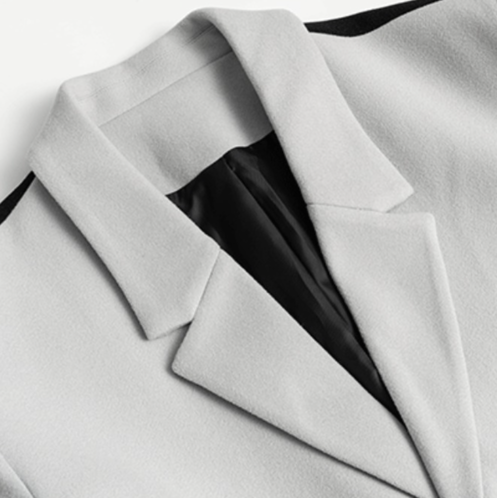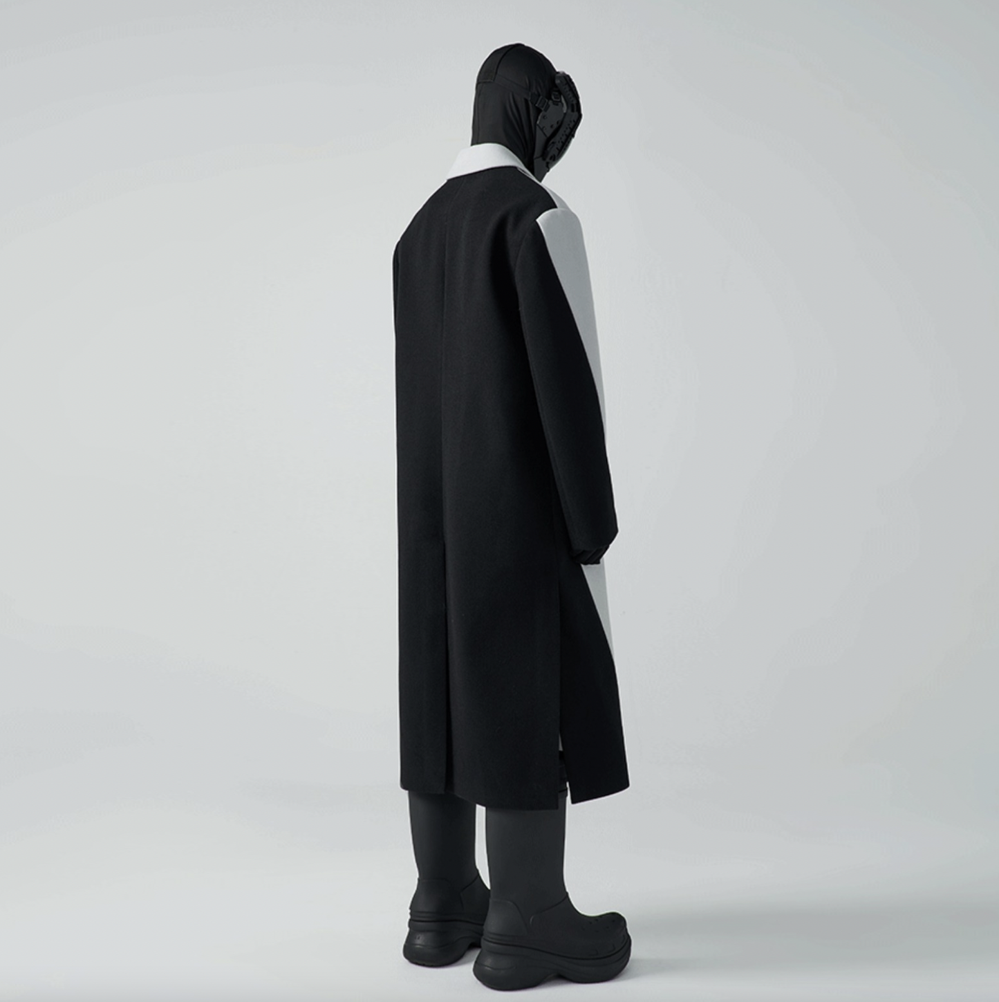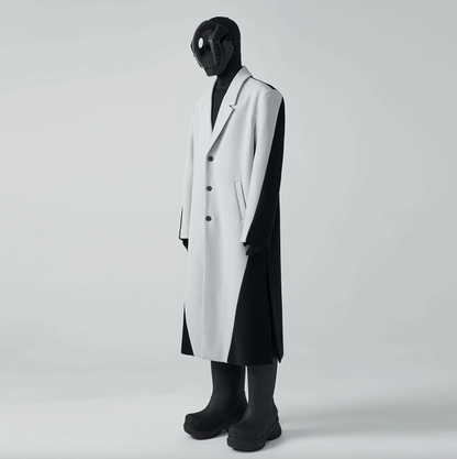 This glorious two-tone coat is crafted with cement wool-blend on the front panel, vibrant black diagonal-cut on the back towards the front hem which is artfully crafted to the label's rebellious spirit.