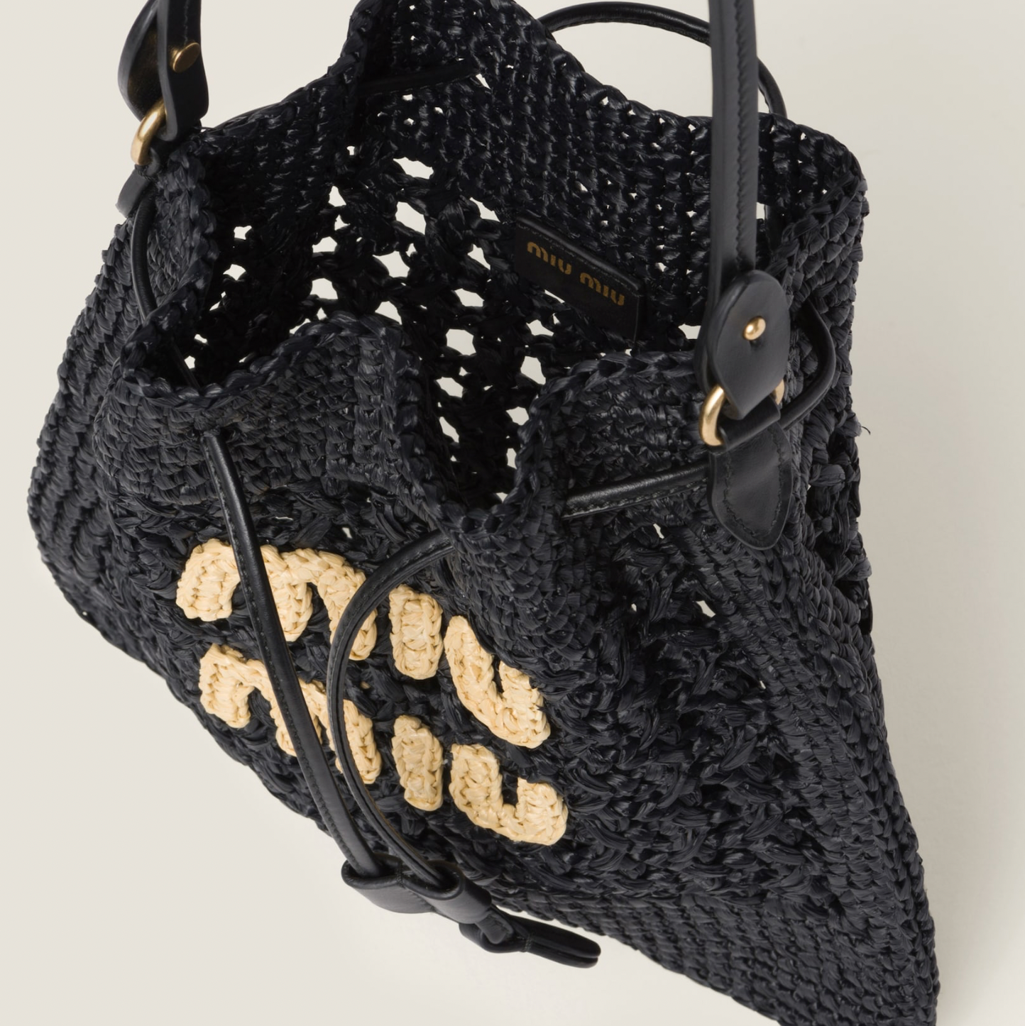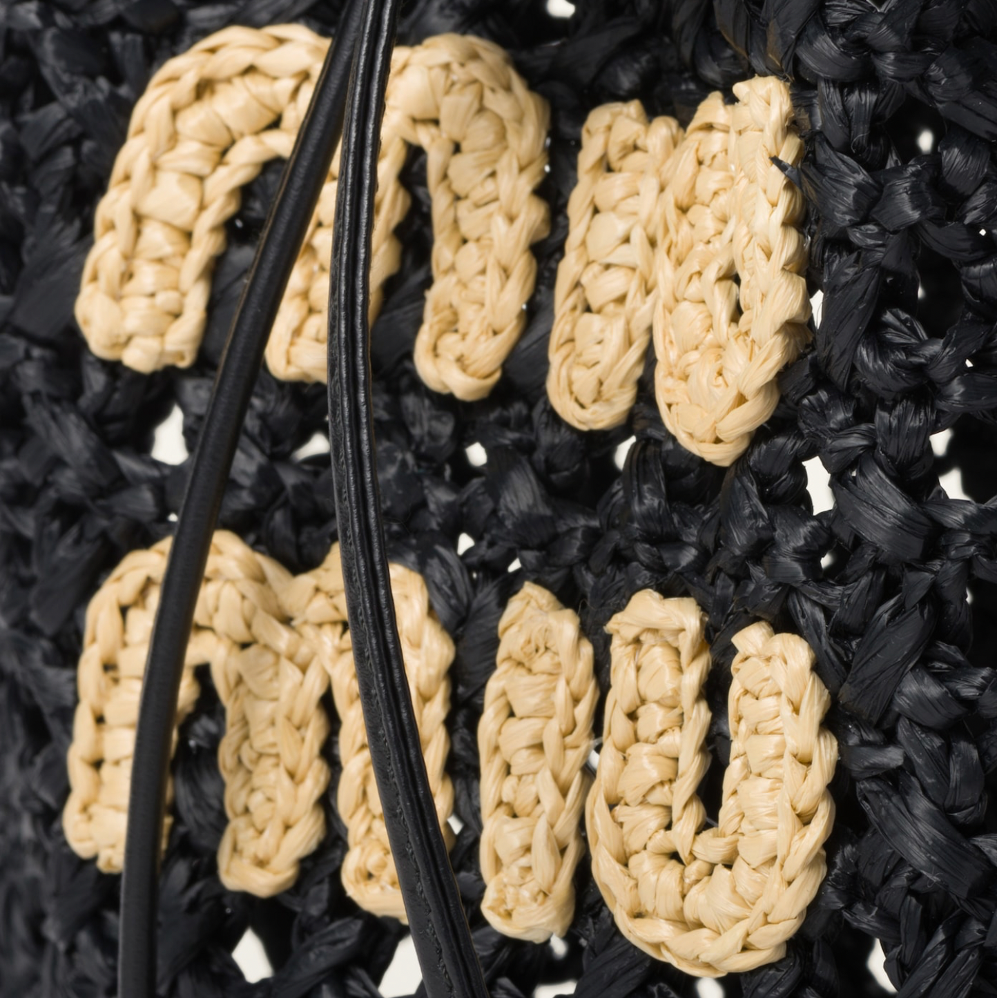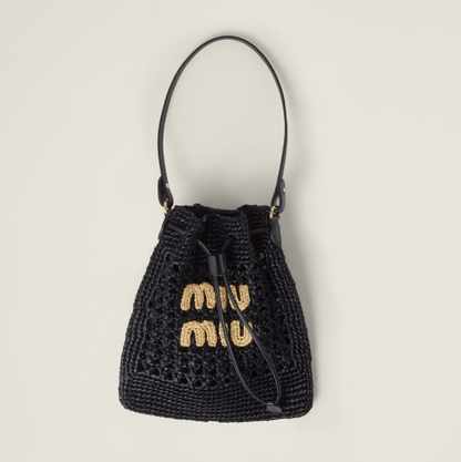 An exotic and refined design characterizes this mini-bag made of woven fabric. The Miu Miu logo stands out thanks to its immediate iconic character while the leather handle and drawstring complete the style with a refined contrast.
