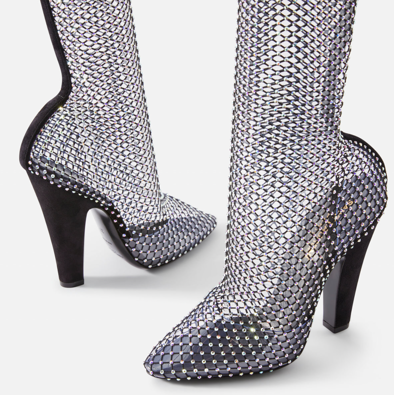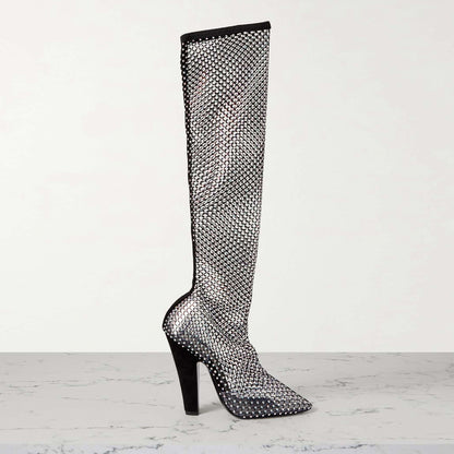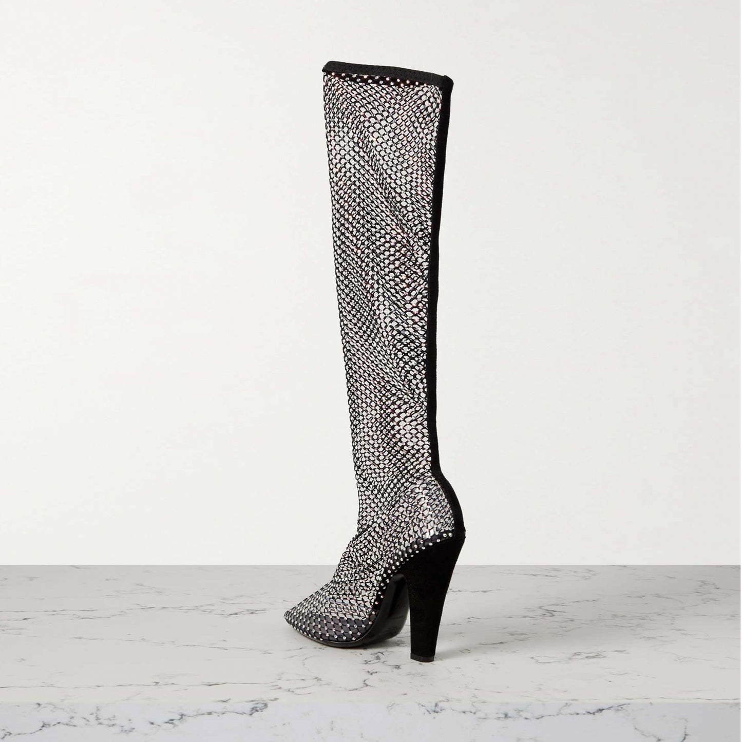 SUEDE-TRIMMED CRYSTAL-EMBELLISHED FISHNET KNEE BOOTS